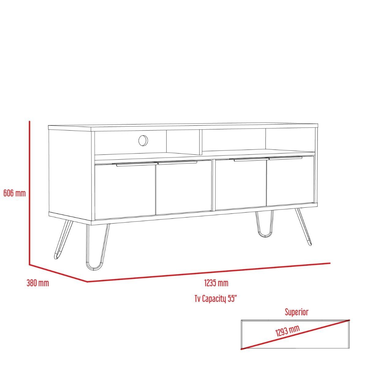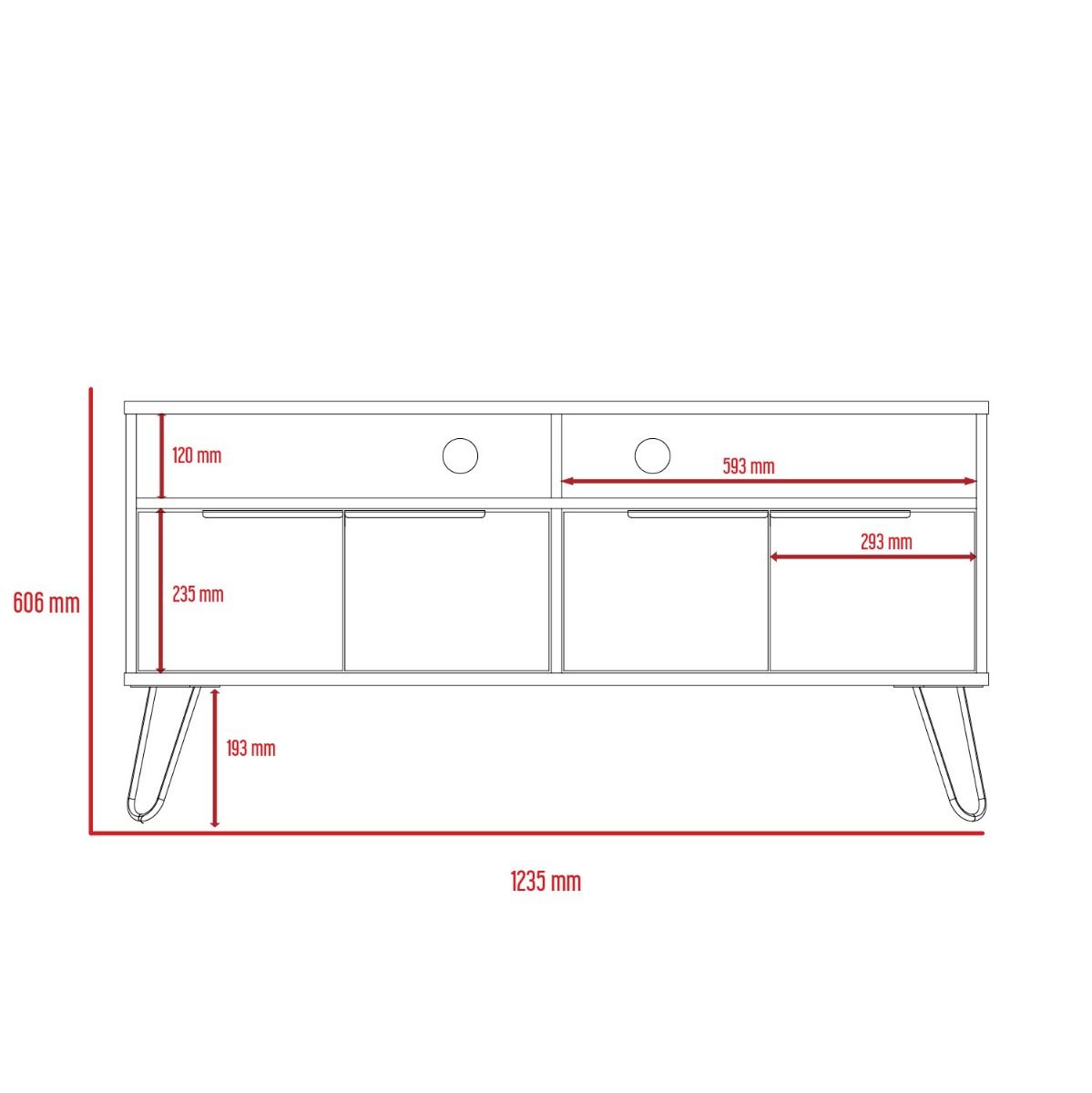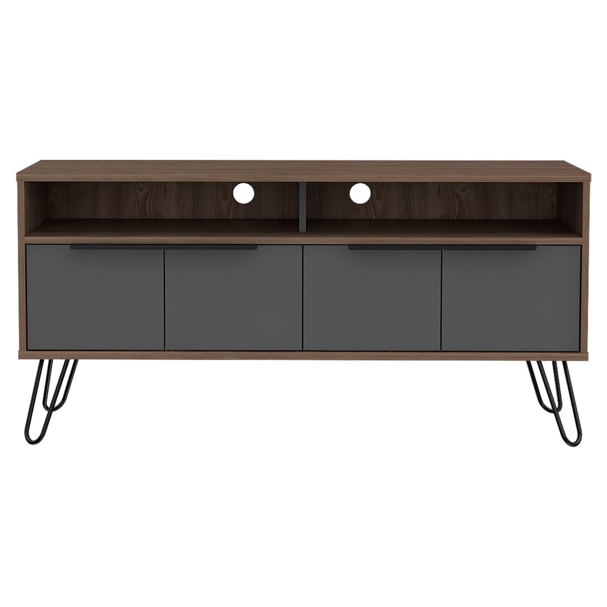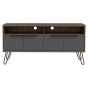 This wide screen TV unit accommodates up to a 55" television with ample open storage for gadgets along with extra storage space encloed behind four doors. , finshed in a bleached oak effect and contrasting grey effect doors with black pull handles and hairpin shape legs