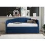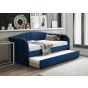 Enhance your space with the Velour Upholstered Guest Bed, available in stylish Blue, Pink, and Grey. This versatile bed frame features a soft, velvet finish fabric and includes a convenient rollout trundle bed underneath, making it perfect for accommodating guests or creating extra sleeping space when needed. The frame can be used as a daybed and easily converts into two single bed frames. Please note that mattresses are not included, but standard single mattresses (90cm x 190cm) are suitable. The lower trundle bed is equipped with castor wheels for effortless mobility, and assembly is required. Overall dimensions: Back height (highest point) 95cm, Side arm height 79cm.