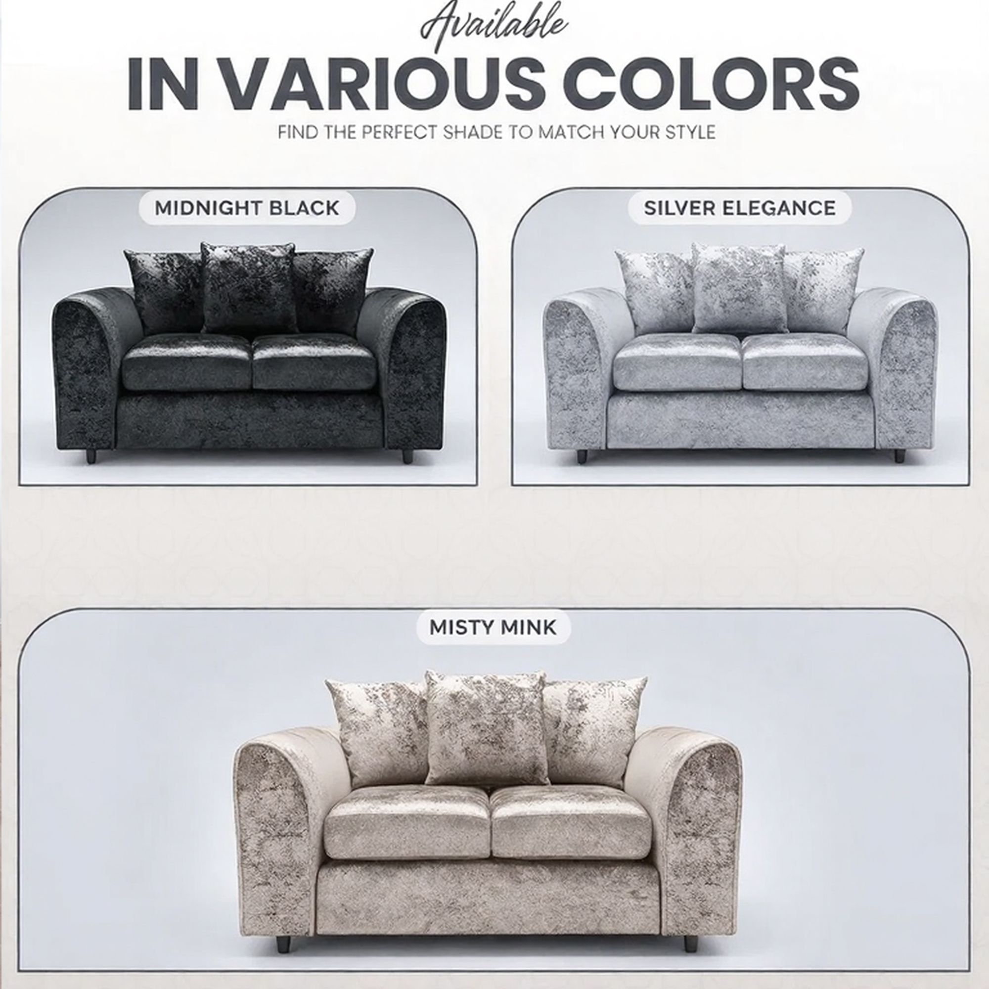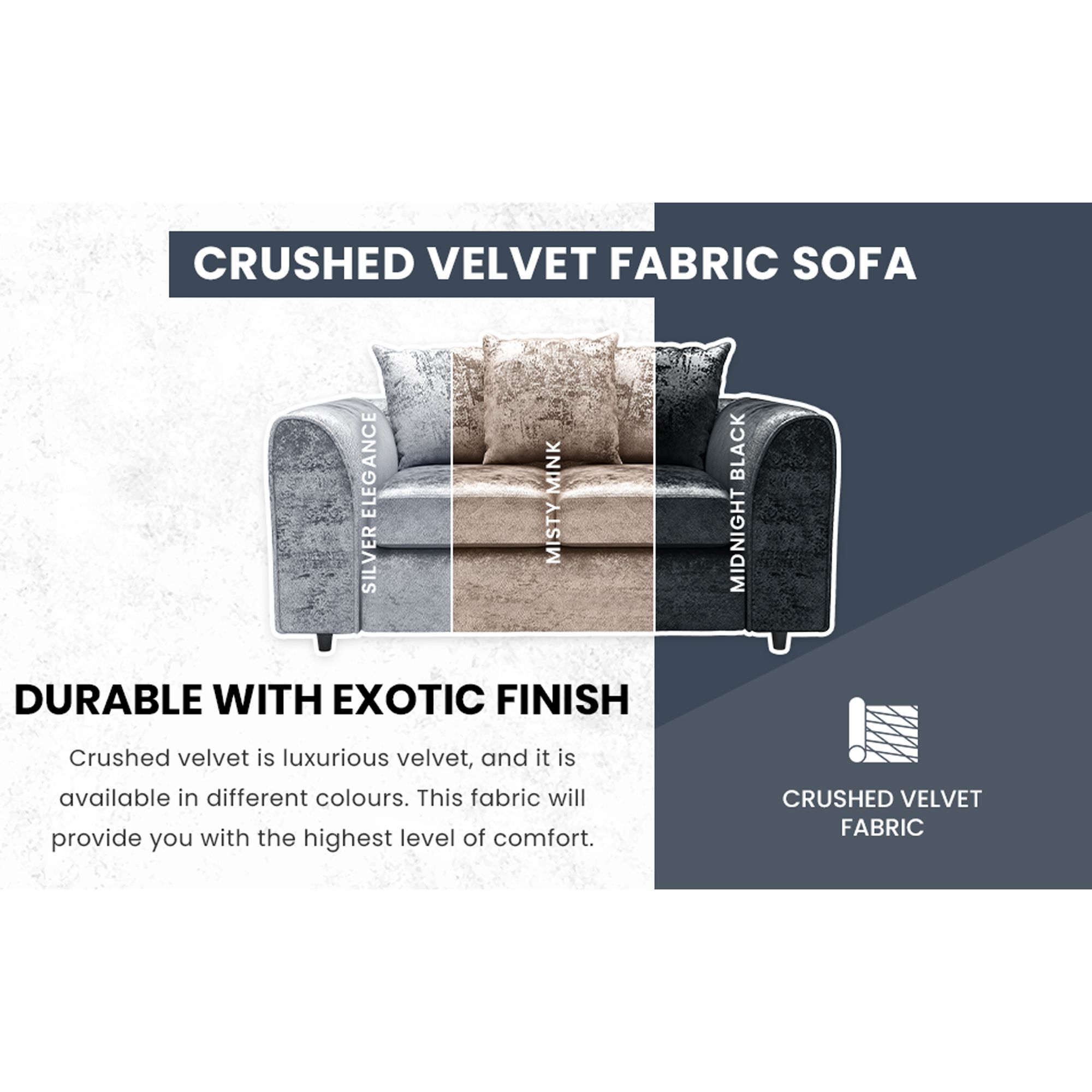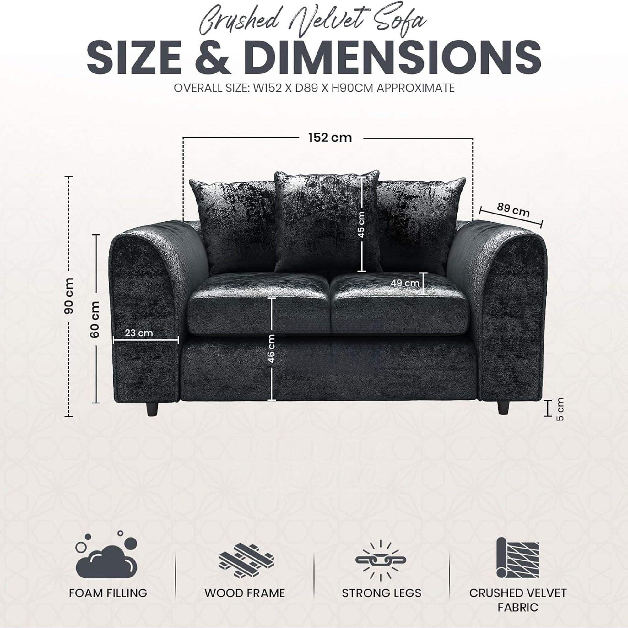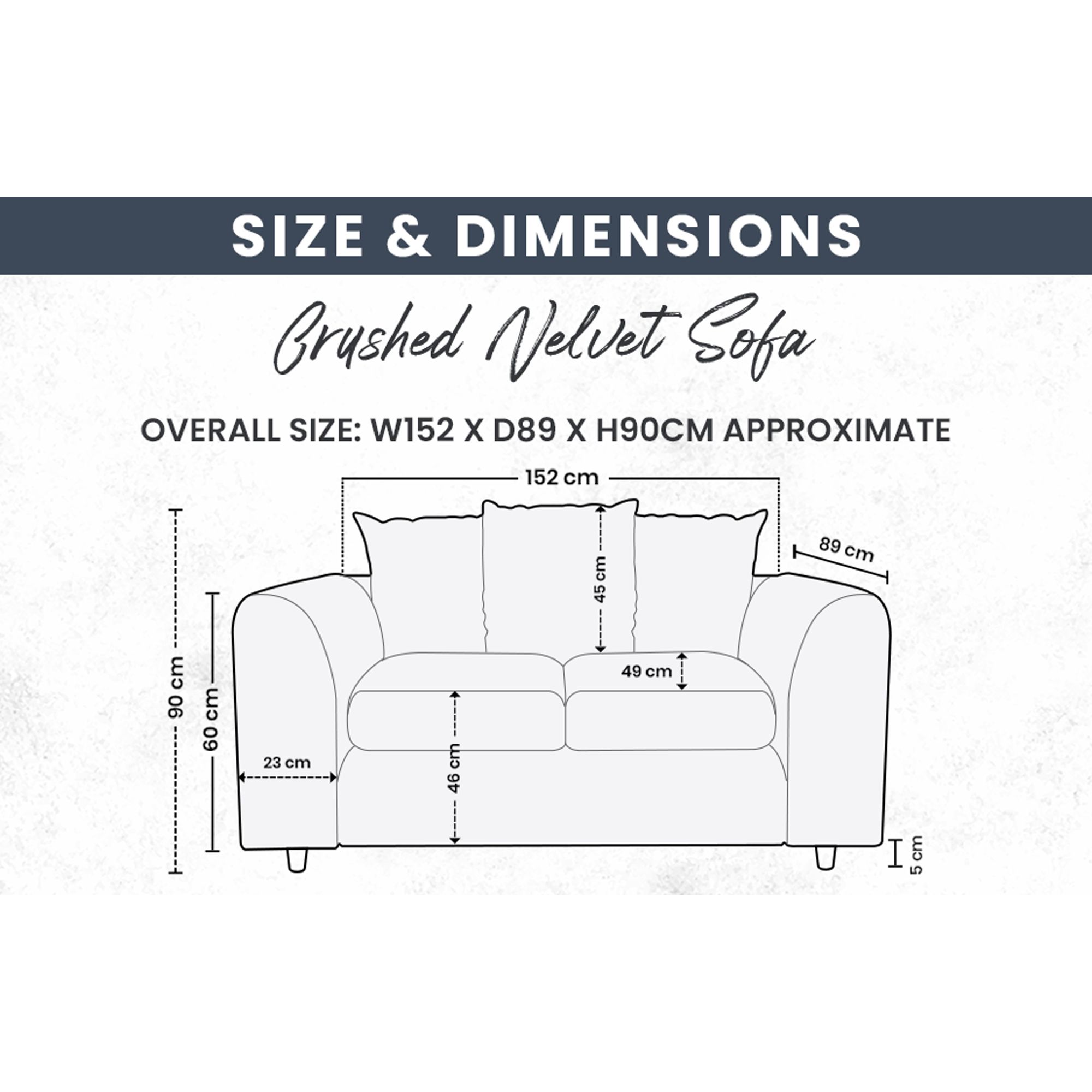 Bring elegance and comfort to smaller spaces with the VELOURA 2 Seater Sofa. Upholstered in crush velvet, it offers a soft, luxurious feel while the sturdy wooden frame ensures lasting durability.