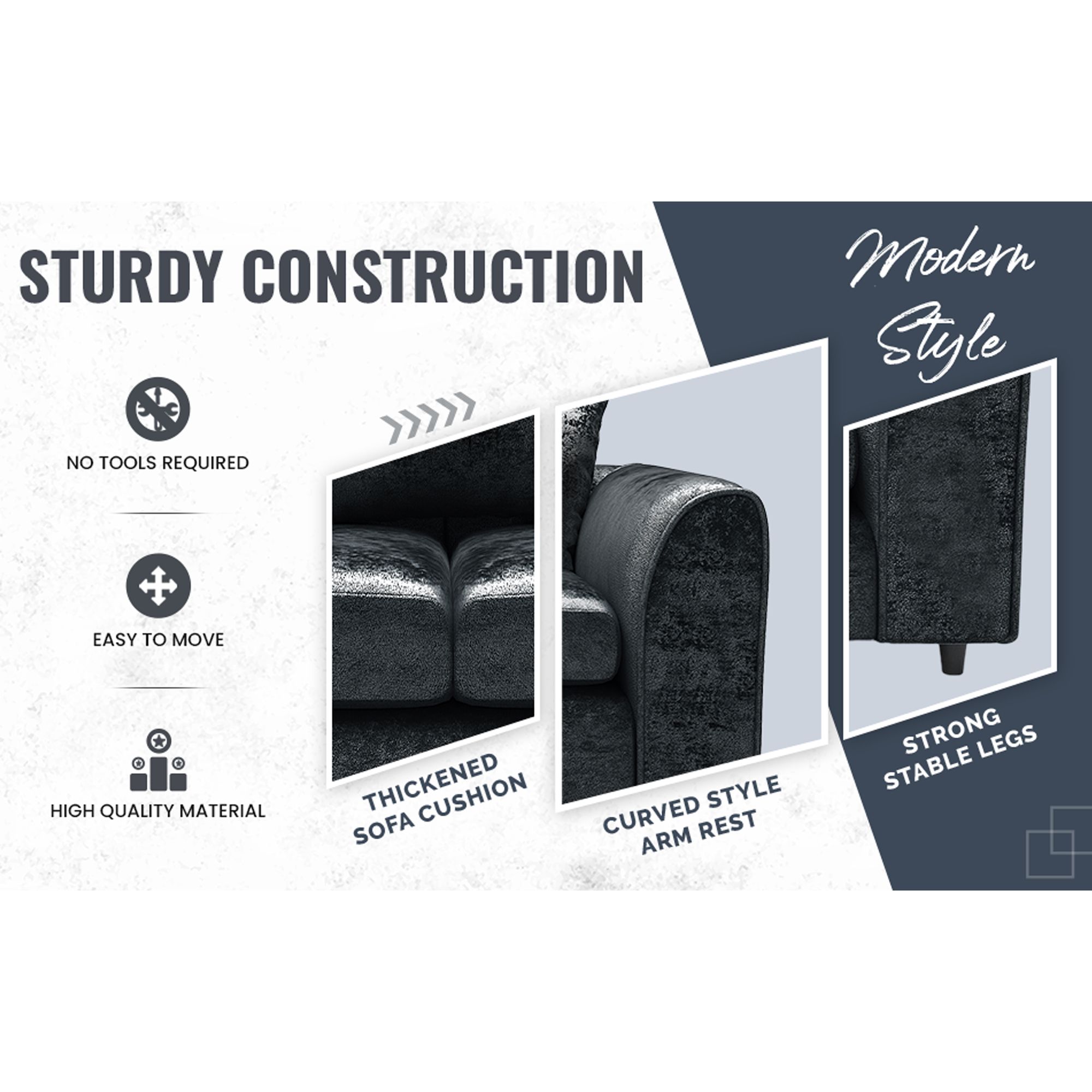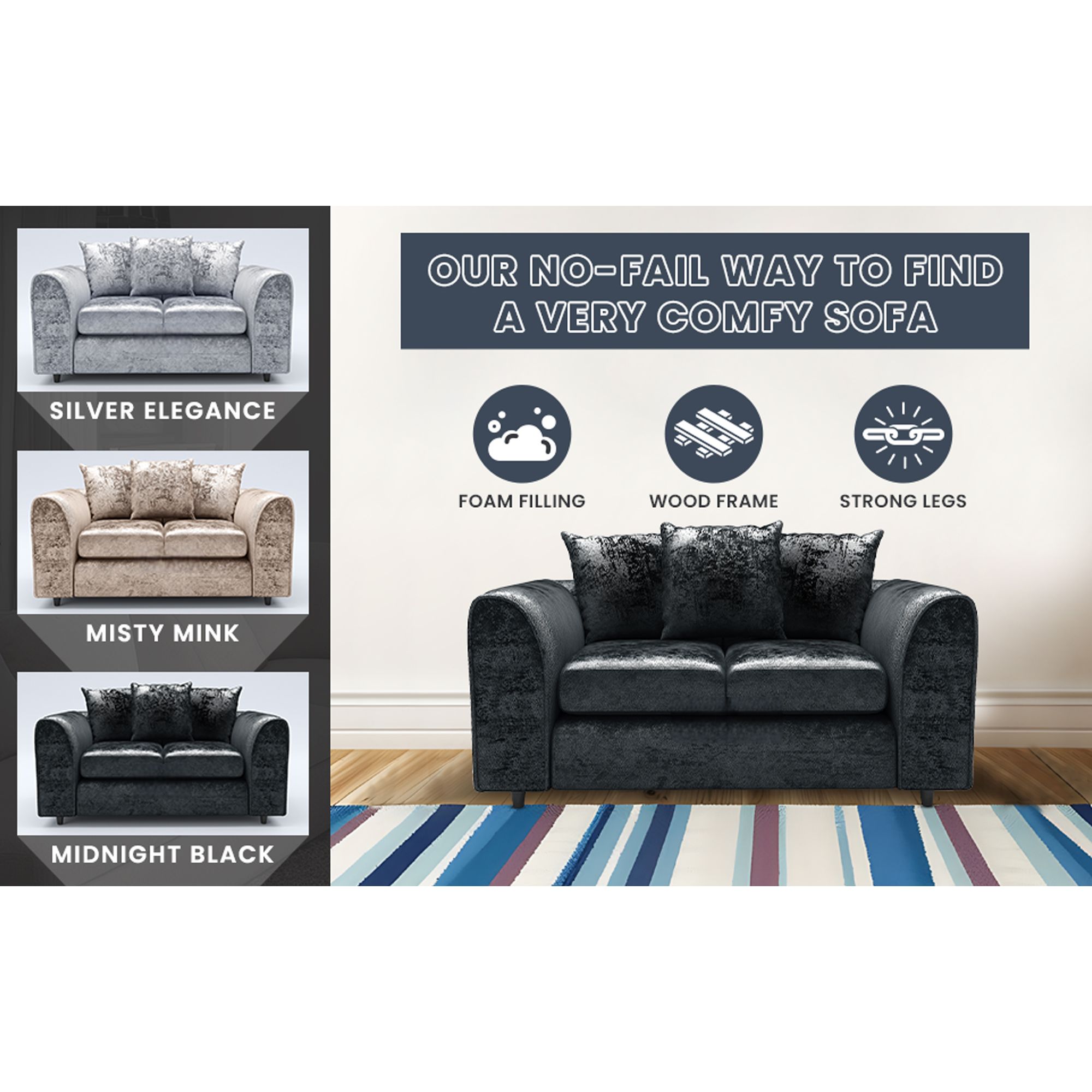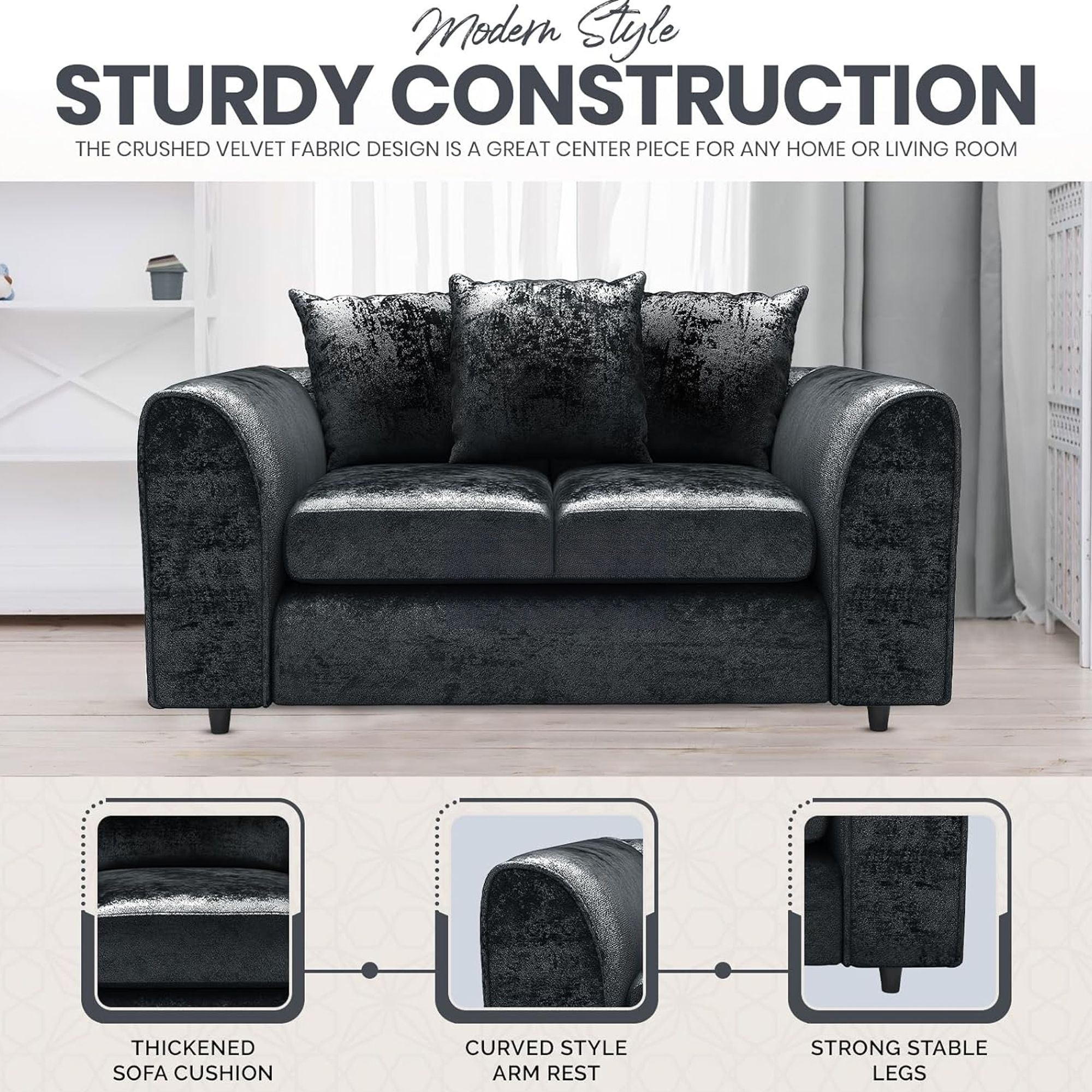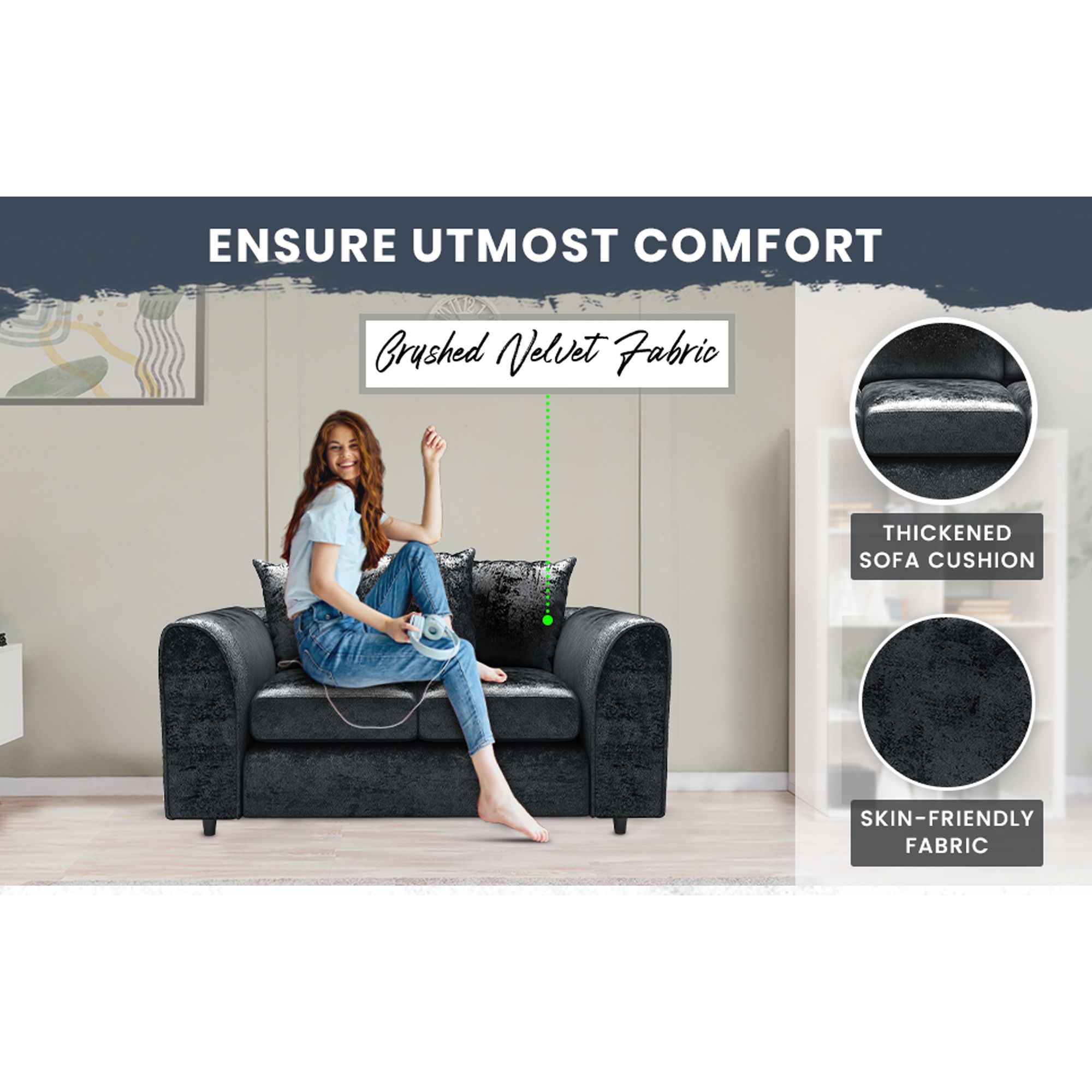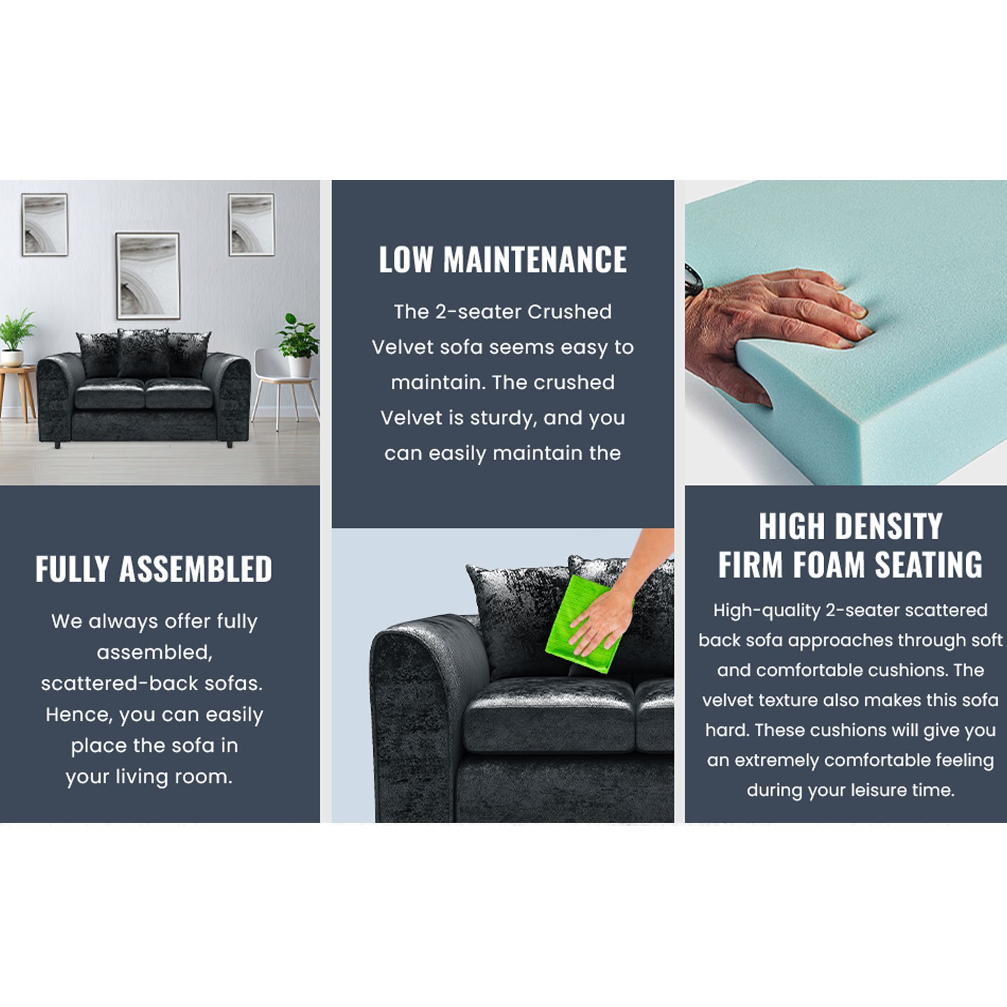 Bring elegance and comfort to smaller spaces with the VELOURA 2 Seater Sofa. Upholstered in crush velvet, it offers a soft, luxurious feel while the sturdy wooden frame ensures lasting durability.