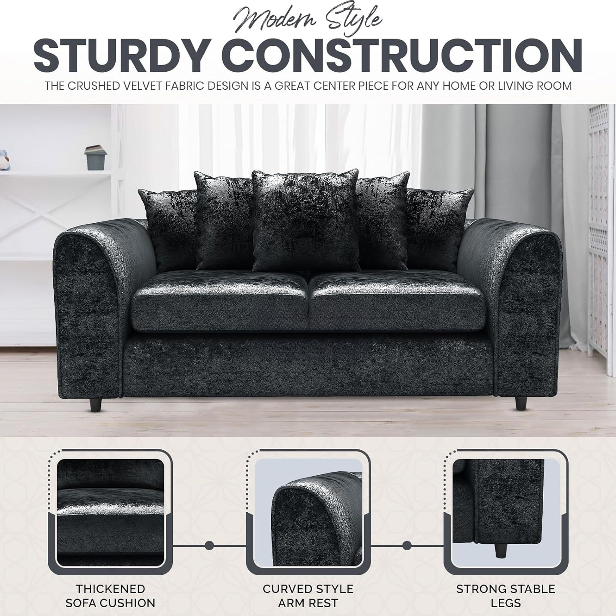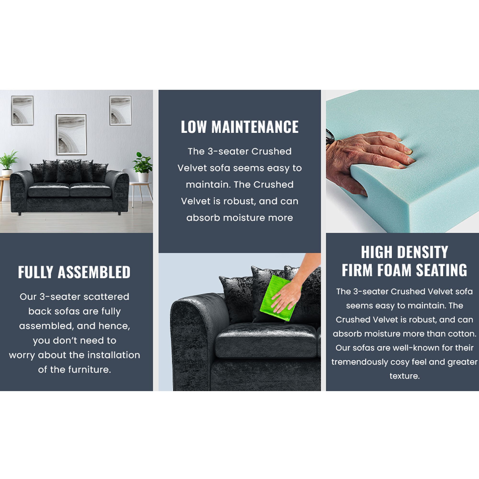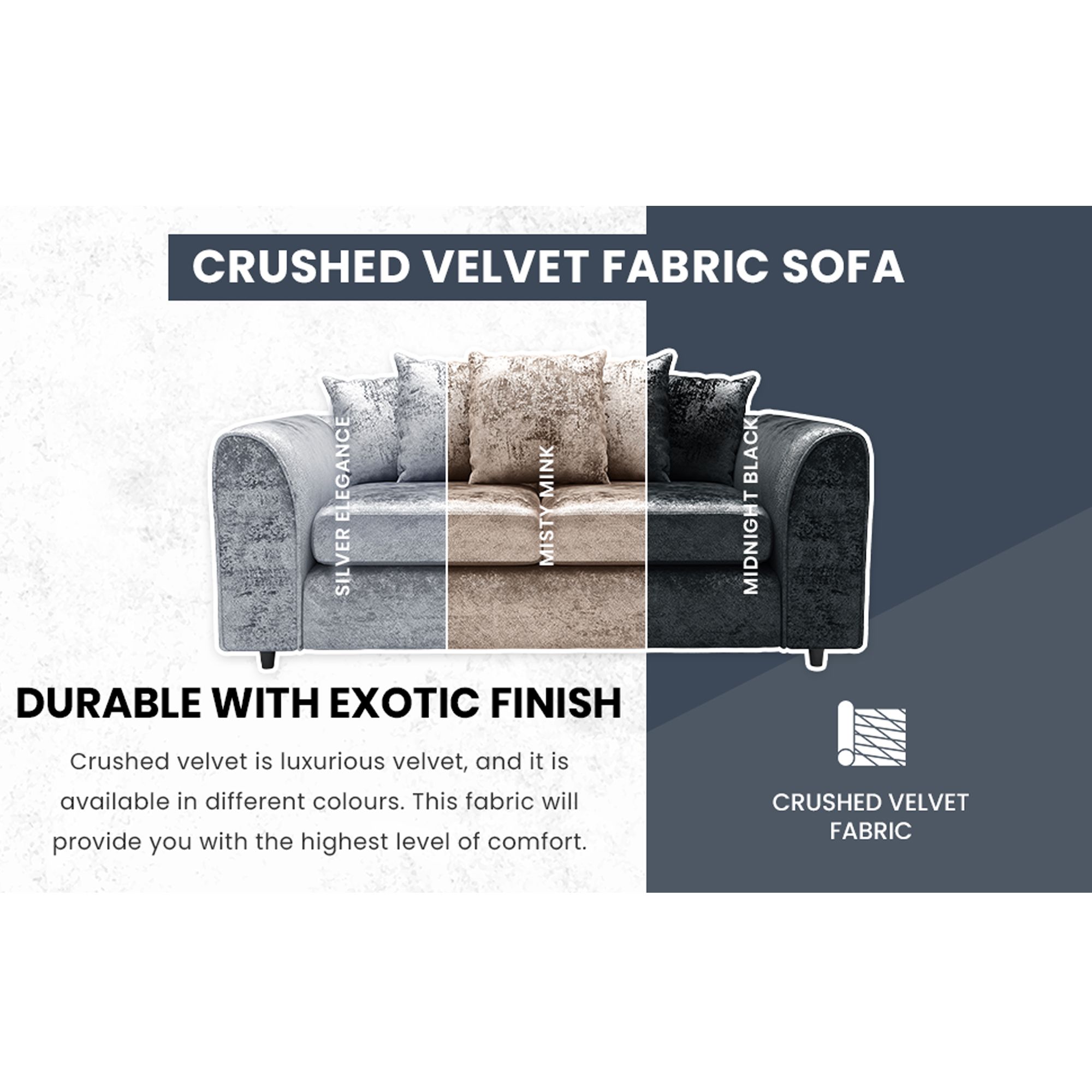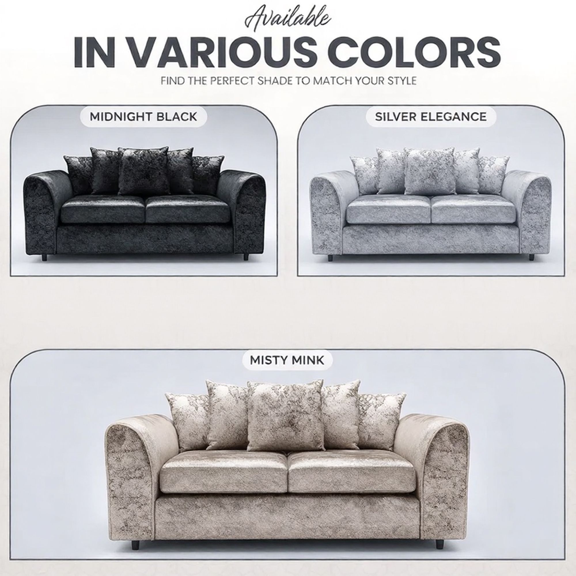 The VELOURA 3 Seater Sofa combines elegance and comfort for any living space. Upholstered in crush velvet, it offers a soft, luxurious feel while the sturdy wooden frame ensures lasting durability.