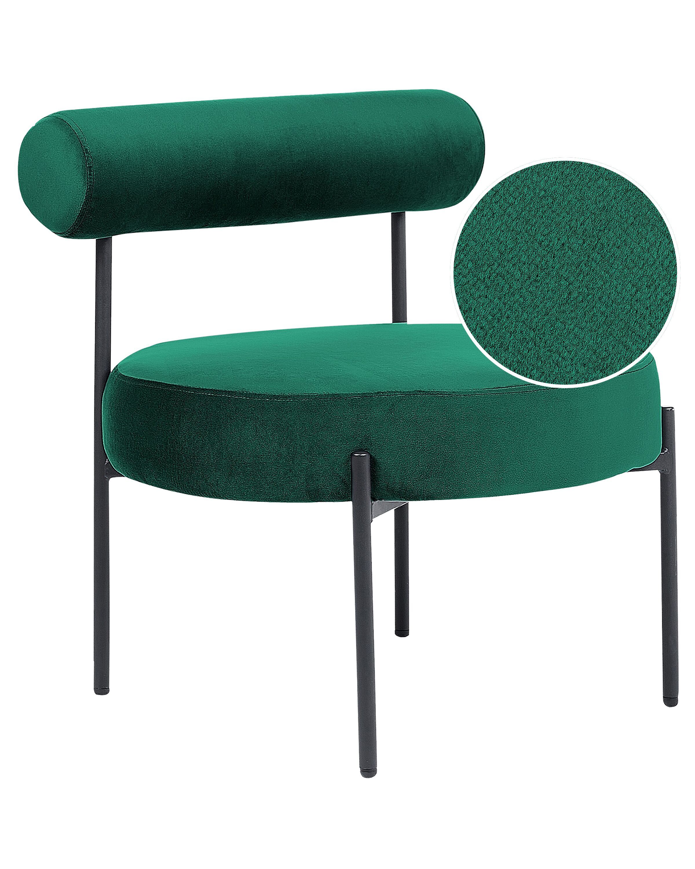 With this retro-inspired chair, your living space will definitely draw attention and charm all your visitors. The piece features a unique design, which is its biggest strength - the capacious, round seat, combined with a bolster cushion back, means the chair will be a perfect spot to unwind and relax after a long day. Placed on sleek, black legs, the chair is very stable, and its emerald green colour makes it go well with many different vintage-themed rooms. What is more, the product is upholstered with pleasant to touch velvet, which doesn't require plenty of maintenance to last for many years. Details: Color: Green, Black. Main material: Velvet. Additional material: Plywood, Steel. Material Composition: 100% Polyester Weight: 7 Assembly: Legs to be Fitted Weight Capacity: 150 Padding Thickness: 12 Seat Height: 40