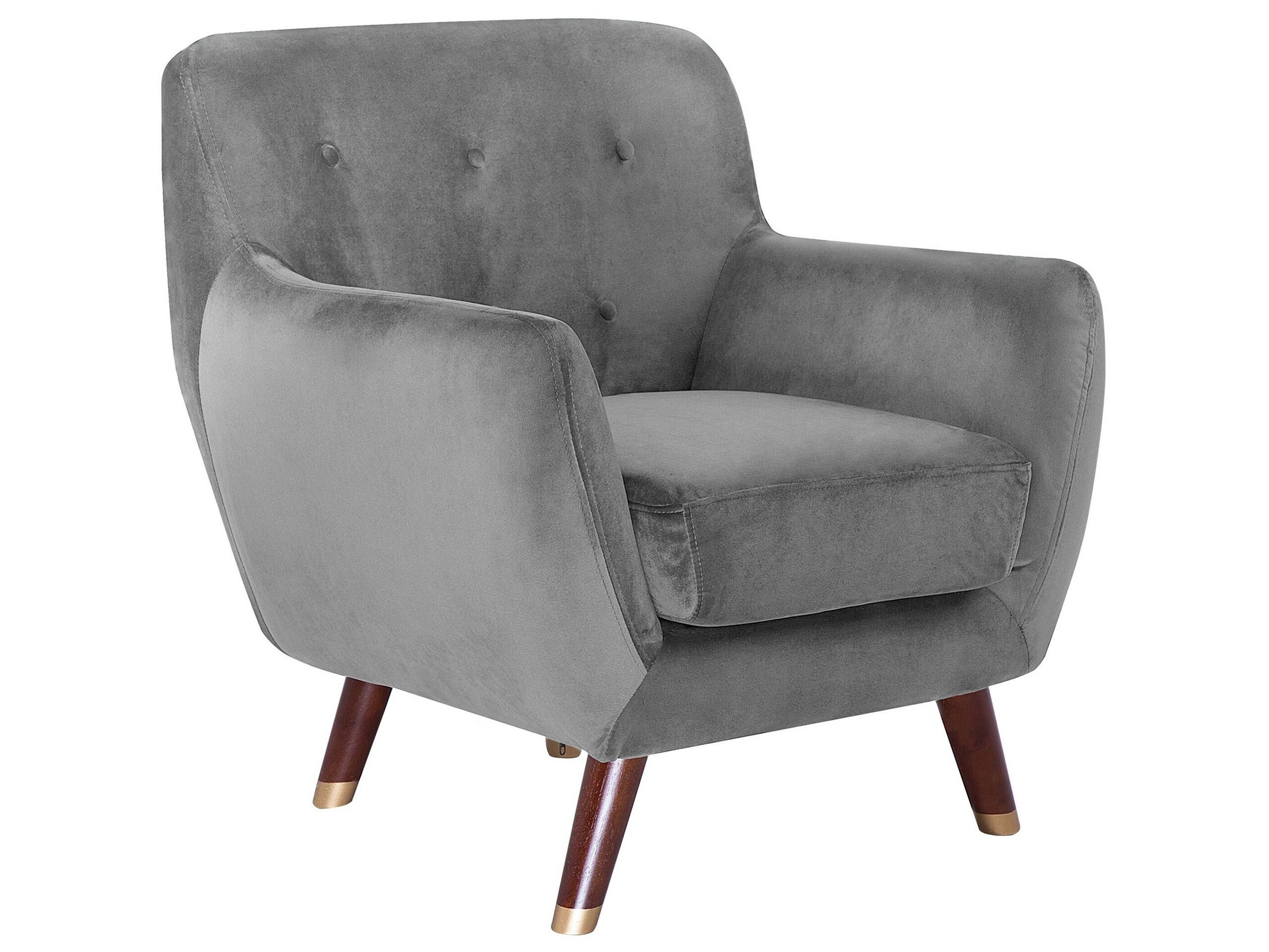 Designed in a beautifully profiled shape, this armchair ensures supremely comfortable lounging. The buttoned backrest, angled armrests and slanted wooden legs take inspiration from the retro forms. The piece is fully upholstered in a wear-resistant, polyester velvet in a neutral grey tone. The seat cushion is generously padded with foam for the highest level of comfort and features a removable cover which makes it easy to care for. Details: Color: Grey, Dark Wood, Gold. Main material: Velvet. Additional material: Rubberwood. Material Composition: 100% Polyester Weight: 22 Assembly: Legs to be Fitted Wood type: Hevea brasiliensis, Eucalyptus grandis Wood Origin: China Weight Capacity: 100 Padding Thickness: 16 Seat Height: 45
