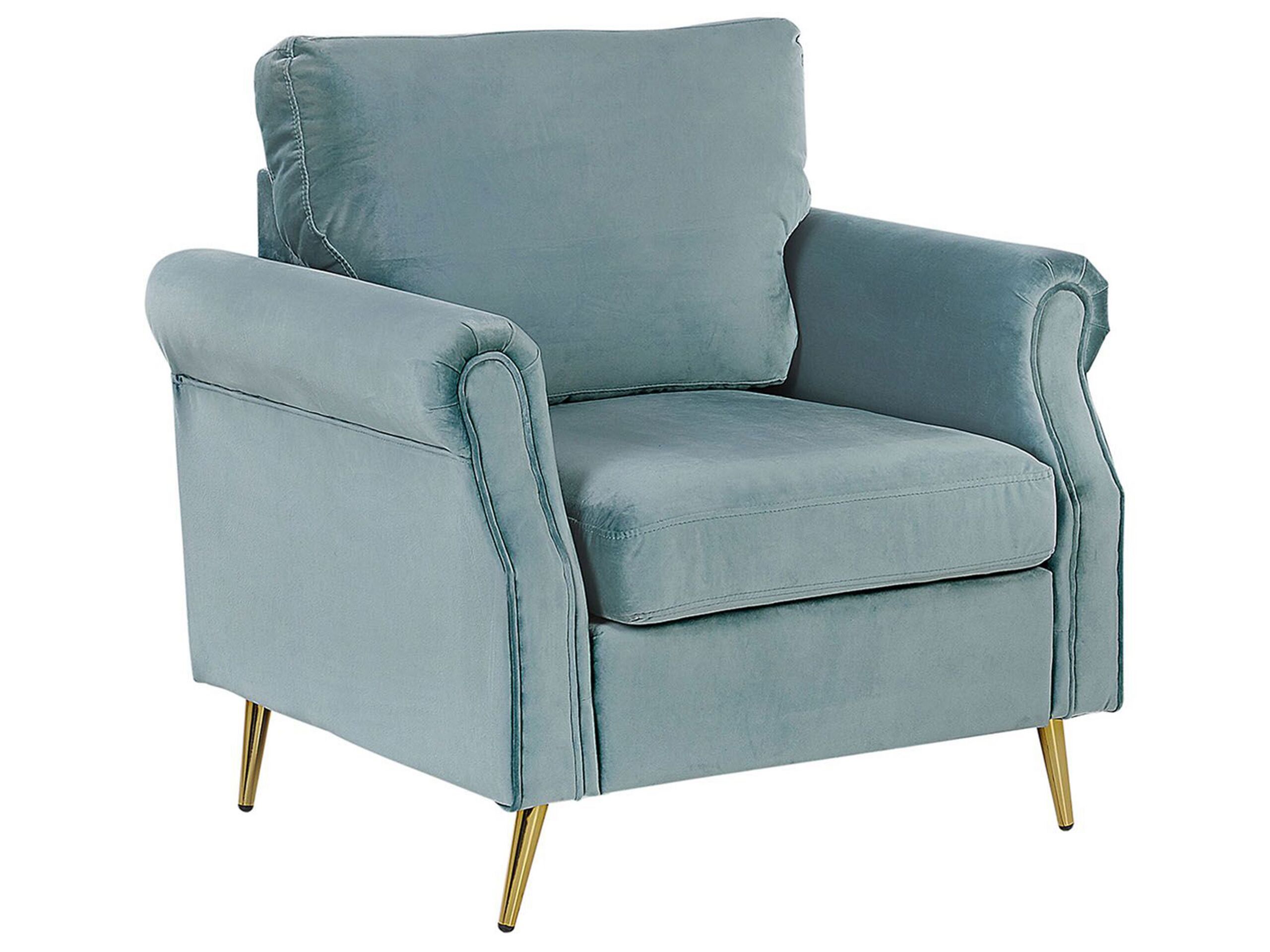 Introduce an elegant touch of glamour to your living room with this marvellous armchair. The combination of simple shapes and retro accents make it an ideal fit for both, modern and traditional interiors. Its soft velvet fabric upholstery characterized by a delicate sheen highlights the chic look of the piece while the wooden construction guarantees durability. Thickly padded cushions make the armchair as comfortable as it gets while the removable cases are exceptionally easy-care. Details: Color: Green, Gold. Main material: Velvet. Additional material: Iron, Plywood, Eucalyptus Wood. Material Composition: 100% Polyester Weight: 22 Assembly: Partial Assembly Required Weight Capacity: 150 Cushions Dimensions: 65x45 Padding Thickness: 10 Seat Height: 46