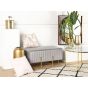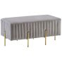 This upholstered bench is a fancy style statement that brings a luxe factor to every décor. The rich texture of velvet is beautifully highlighted by vertical tufting giving the piece a glamorous appearance. With its versatile, rectangular shape it can be used in a hallway, living room or at the foot of a bed. The bench looks fantastic as a single accent piece and would be a fitting addition to glam and eclectic interiors. Details: Color: Grey, Gold. Main material: Velvet. Additional material: Metal, Foam. Material Composition: 100% Polyester Weight: 10 Assembly: Does Not Require Assembly Weight Capacity: 150 Padding Thickness: 28