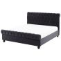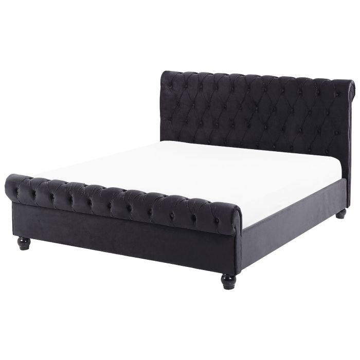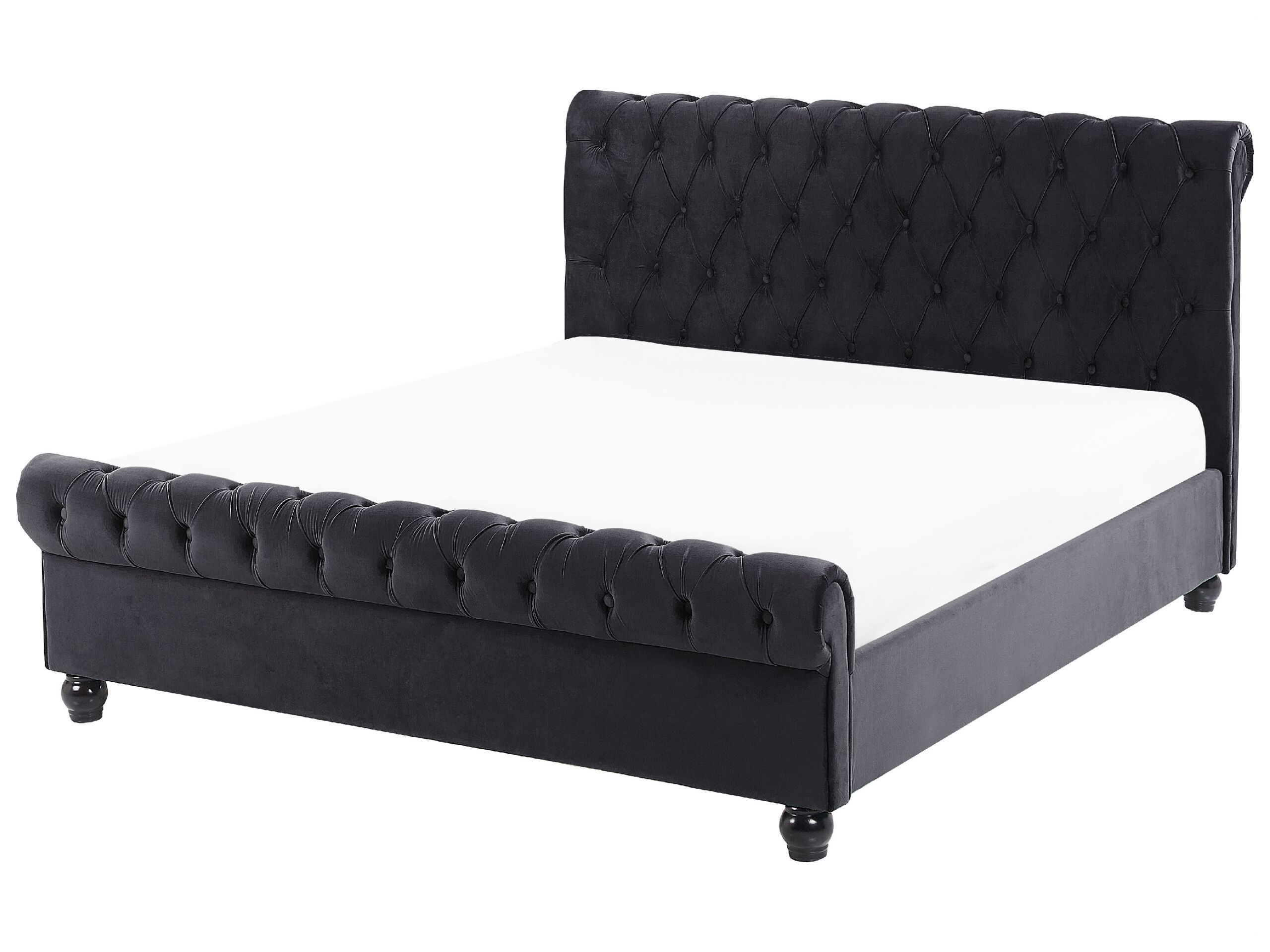 Elevate your bedroom with this unique luxury bed. An elegant rolled headboard and a low front complete the chic silhouette of the frame. The bed is made of soft, delicate velvet fabric in a black shade, which is easy to look after and pleasant to touch. The decorative needlework with round buttons is a perfect finish to this standout piece. This bed is a must-have for vintage, modern retro or English-style bedrooms. Details: Color: Black. Main material: Velvet. Additional material: Polyester, Plywood, Poplar Wood. Material Composition: 100% Polyester Weight: 42 Assembly: Full Assembly Required Wood type: Populus Wood Origin: China Weight Capacity: 220 Legs Height: 8 Sleeping Surface: 140x200