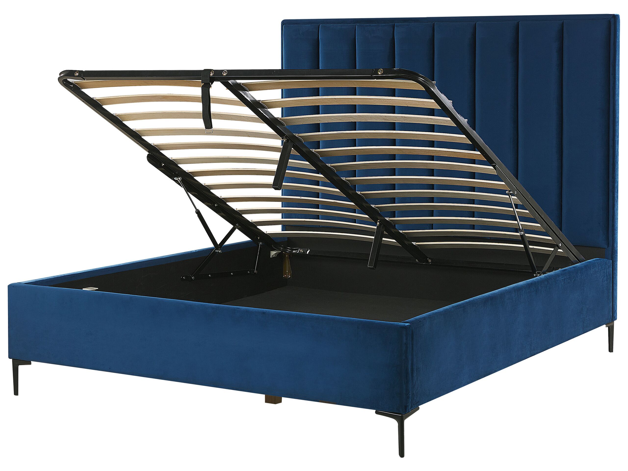 This beautiful bed is a perfect embellishment of any master suite. The classic shapes and beautiful upholstery make it a true centrepiece of virtually any setting. Its robust and durable frame is fully covered with high-quality velvet fabric which, thanks to its lovely sheen, gives it a high-end, upscale look. The headboard boasts modern, vertical padding matched with metal, black legs for a minimalist touch. The bed offers capacious, lift-up storage that will help you efficiently organize your bedroom space. Details: Color: Blue, Black. Main material: Velvet. Additional material: Iron, Pine Wood, Poplar Wood. Material Composition: 100% Polyester Weight: 72 Assembly: Full Assembly Required Wood type: Populus, Pinus massoniana Wood Origin: China Weight Capacity: 220 Legs Height: 16 Sleeping Surface: 140x200