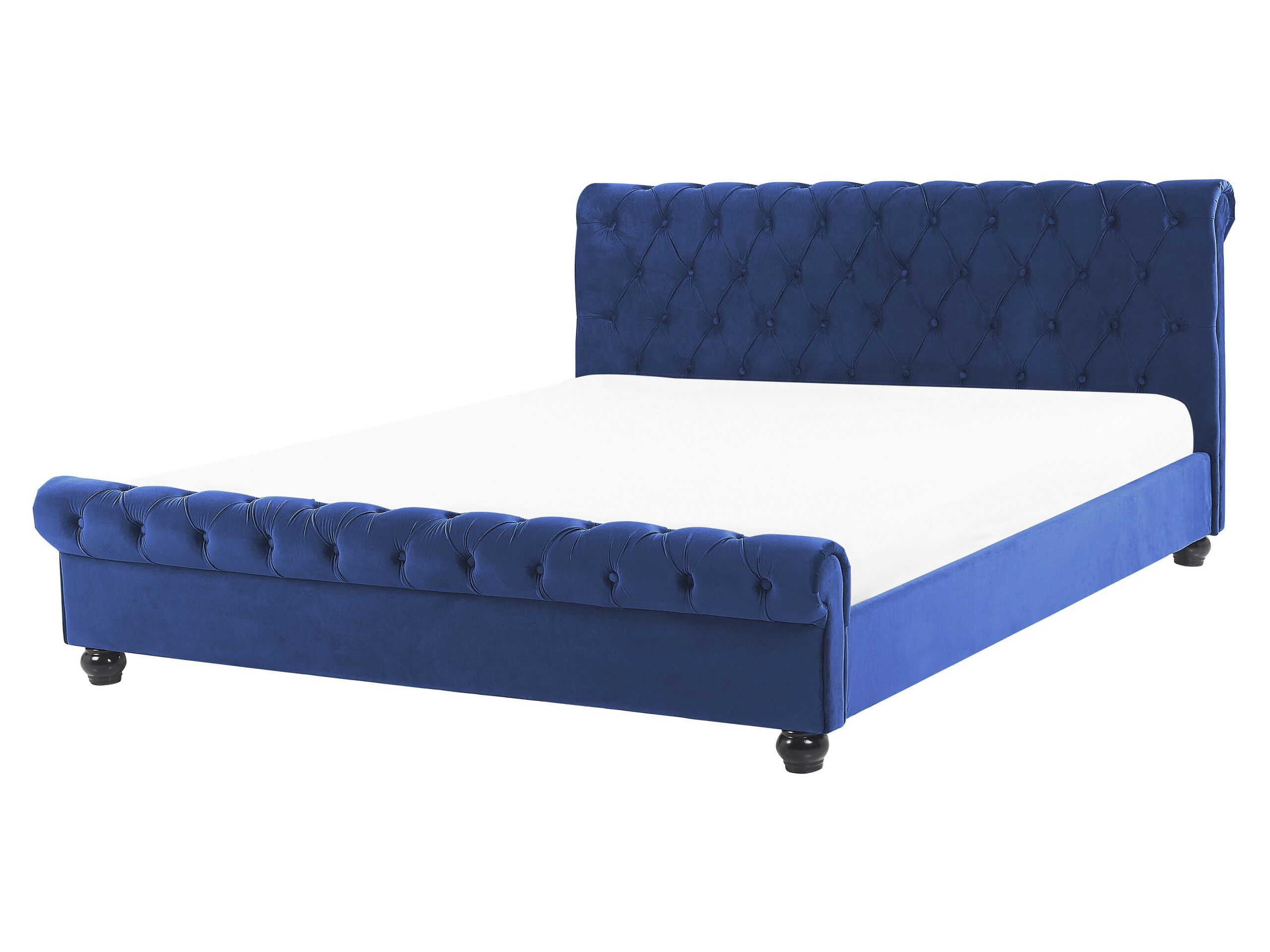 Elevate your bedroom with this unique luxury bed. An elegant rolled headboard and a low front complete the chic silhouette of the frame. The bed is made of soft, delicate velvet fabric in a blue shade, which is easy to look after and pleasant to touch. The decorative needlework with round buttons is a perfect finish to this standout piece. This bed is a must-have for vintage, modern retro or English-style bedrooms. Details: Color: Blue, Dark Wood. Main material: Velvet. Additional material: Polyester, Plywood, Poplar Wood. Material Composition: 100% Polyester Weight: 49 Assembly: Full Assembly Required Wood type: Populus Wood Origin: China Weight Capacity: 200 Legs Height: 8 Sleeping Surface: 160x200