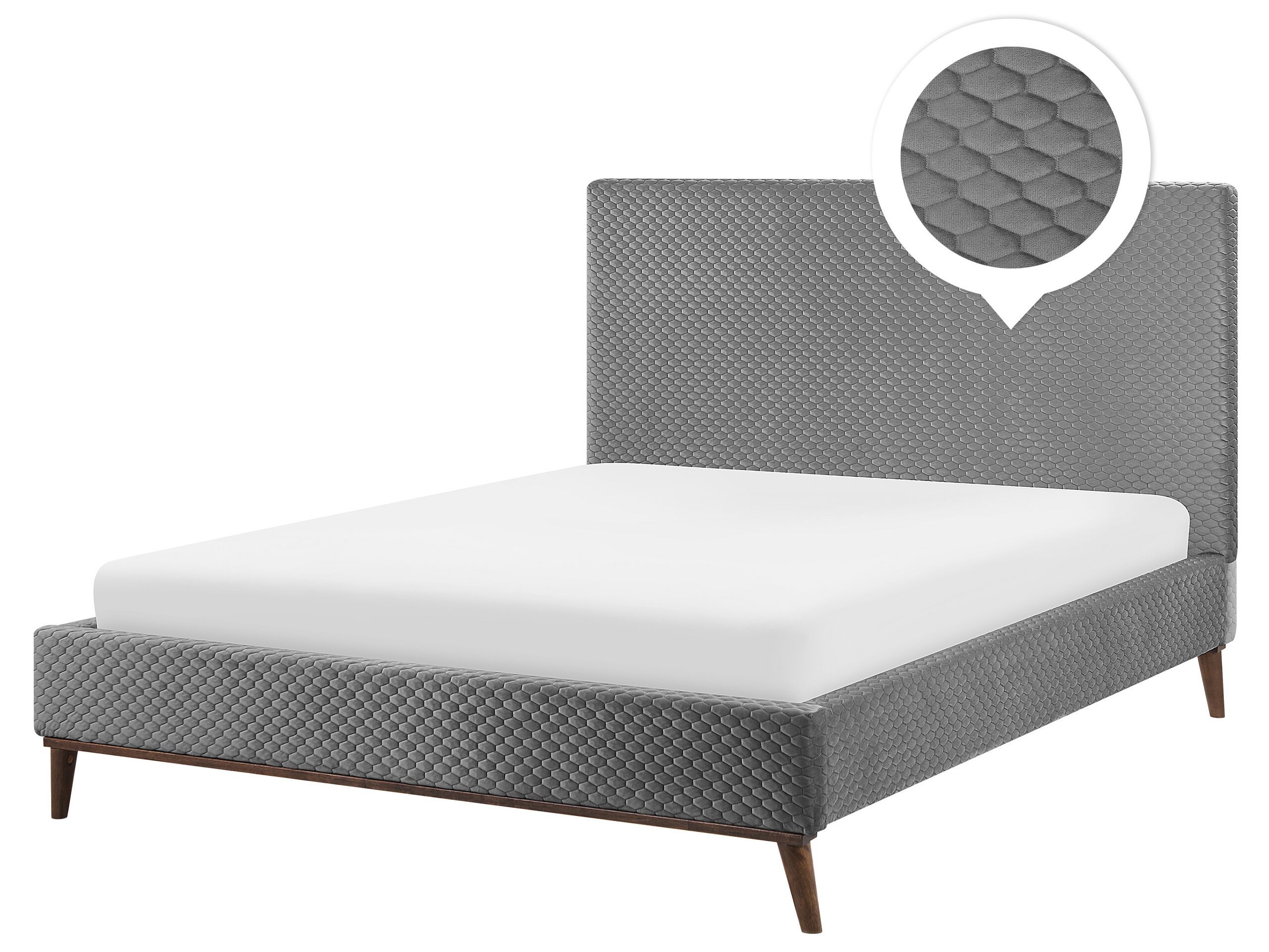 This modern bed is an ideal fit for a bedroom which aims for a perfect balance between elegance and simplicity. With a quilted headboard in a rectangular shape, and all sides featuring a soft, easy-care fabric in grey, it looks outstanding in any type of setting. Wooden construction ensures long-term stability, while the stylish legs, made of dark wood, beautifully harmonise with the whole piece. Details: Color: Grey, Dark Wood. Main material: Velvet. Additional material: Polyester, Plywood, Rubberwood, MDF. Material Composition: 100% Polyester Weight: 45 Assembly: Full Assembly Required Wood type: Hevea brasiliensis Wood Origin: Malaysia Weight Capacity: 200 Legs Height: 15.5 Sleeping Surface: 160x200