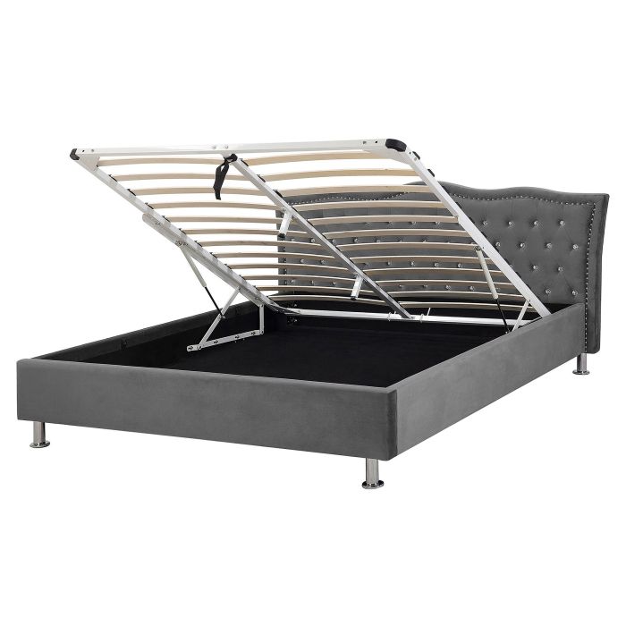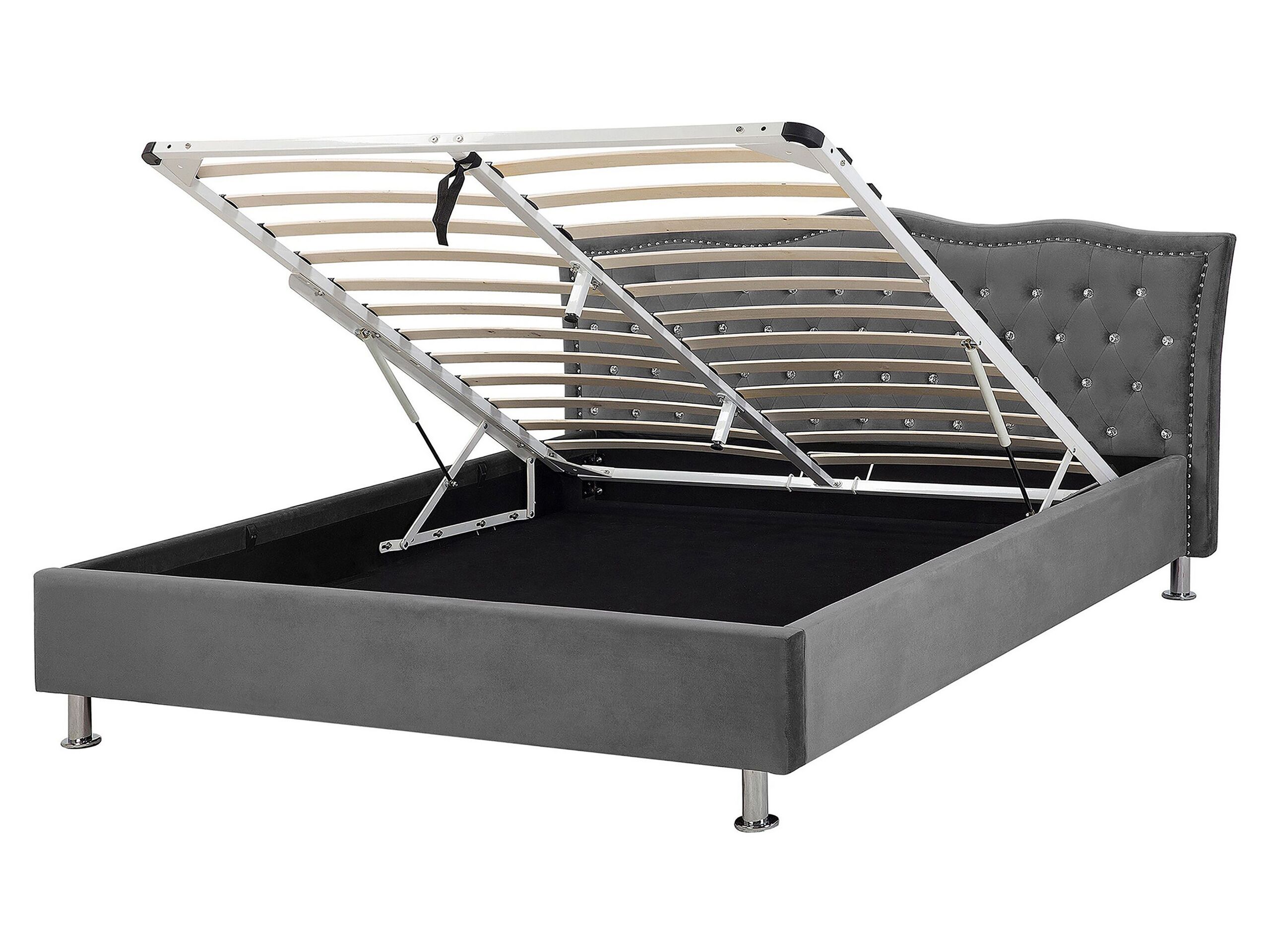 The bed is a true accent piece that would enliven any bedroom. Classic shapes are complemented by modern details such as shiny button tufting and nailhead trim. The bed is upholstered in a high-quality polyester velvet that is easy to look after. The robust frame provides the mattress support and stability, ensuring a comfortable sleep. Additional storage space is provided with a capacious compartment, which will help you to keep your bedroom neat and well-organized. Details: Color: Grey. Main material: Velvet. Additional material: Metal. Material Composition: 100% Polyester Weight: 75 Assembly: Full Assembly Required Wood type: Populus Wood Origin: China Weight Capacity: 350 Legs Height: 11 Sleeping Surface: 160x200