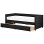 With its horizontal panel tufting and velvet smooth soft upholstery, this daybed exudes an elegant sheen that enhances any space. Beyond its aesthetic charm, it offers a practical solution – a functional extra sleeping space. The added convenience of two spacious drawers ensures ample storage. It serves as a versatile 2-in-1 sofa and bed, perfect for both crowded living areas and kids' bedrooms, effortlessly combining fashion with functionality. Details: Color: Black. Main material: Velvet. Additional material: MDF, Particle Board, Rubberwood. Material Composition: 100% Polyester Weight: 49 Assembly: Full Assembly Required Wood type: Hevea brasiliensis Wood Origin: Malaysia Weight Capacity: 250 Sleeping Surface: 90x200
