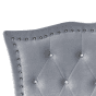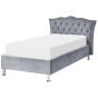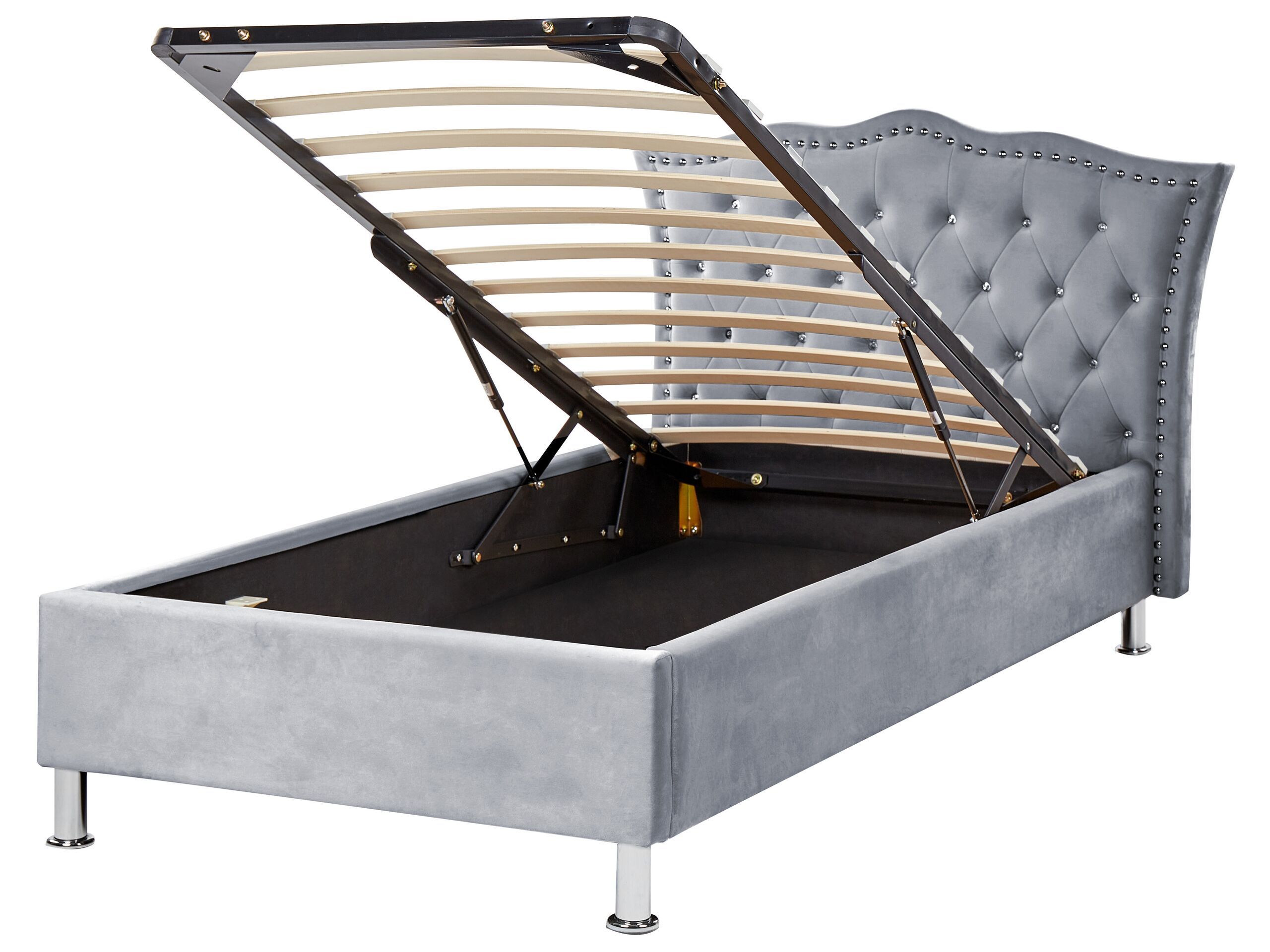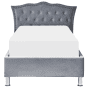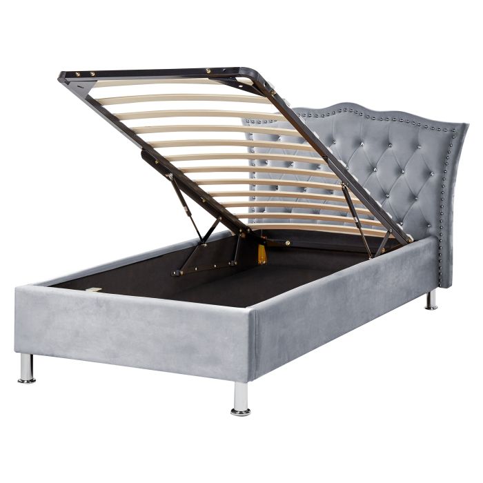 Allow your child to sleep like royalty in this charming bed. It is designed with a glam style and effortlessly transforms any space into a sophisticated haven. Upholstered in high-quality velvet, it is elegant, durable, and easy to maintain. The button tufting, adorned with faux crystals, adds a sparkling allure, while the nail head trim enhances its glamorous appeal. The robust frame provides the mattress support and stability, ensuring a comfortable sleep. Additional storage space is provided with a capacious compartment, which will help you to keep your bedroom neat and well-organized. Details: Color: Grey, Silver. Main material: Velvet. Additional material: Metal, Plywood, Poplar Wood. Material Composition: 100% Polyester Weight: 57 Assembly: Full Assembly Required Wood type: Populus Wood Origin: China Weight Capacity: 100 Legs Height: 13 Sleeping Surface: 90x200