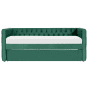 Add a functional, yet elegant and stylish piece to your living room, guest bedroom or kids room with this glamour trundle bed. Thanks to the solid frame made out of eucalyptus wood and poplar slats, it offers stability and durability for years to come. Velvet upholstery is soft to the touch and finished with decorative buttons and nailhead trims, so it gives this bed a chic flair that upgrades any rooms' arrangement. Details: Color: Green. Main material: Velvet. Additional material: Synthetic Material, Plywood, Poplar Wood, Eucalyptus Wood. Material Composition: 100% Polyester Weight: 64 Assembly: Full Assembly Required Wood type: Eucalyptus grandis Wood Origin: China Weight Capacity: 272 Legs Height: 3 Sleeping Surface: 90x200