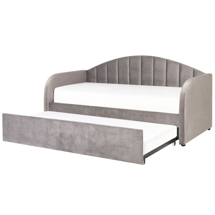This multifunctional bed is the perfect piece of furniture for a children's or guest room. The velvet upholstery in grey colour and the trendy design make it a timeless décor piece. Thanks to the backrest, the bed can be used as a sofa and by pulling out the lower part, you can easily get an extra sleeping surface. The durable frame, slatted bases and stable construction guarantee quality for a long time. Details: Color: Grey. Main material: Velvet. Additional material: Eucalyptus Wood, Plywood. Material Composition: 100% Polyester Weight: 59 Assembly: Full Assembly Required Wood type: Eucalyptus grandis Wood Origin: China Weight Capacity: 160 Legs Height: 7 Sleeping Surface: 90x200