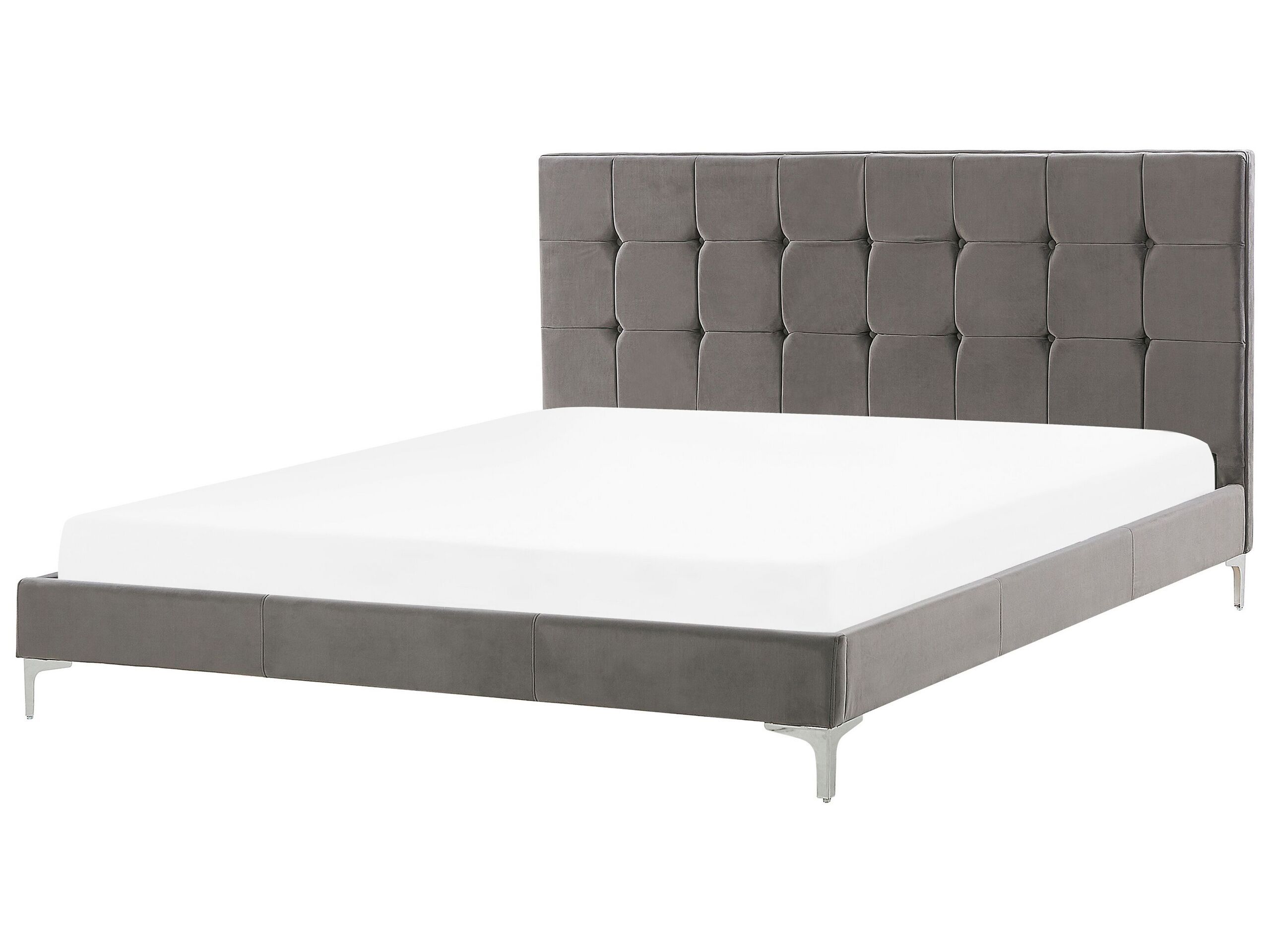 With this upholstered bed created by combining straightforward modern shapes with classic decorative touches your bedroom will get a stylish look. Its low-profile frame is covered in gorgeously smooth to the touch velvet and complemented by simple metal legs. The tall headboard is thickly cushioned so that you can comfortably lean against and enjoy your favourite book or relax with bedtime TV. Deep button tufting lends the bed a luxurious flair making it a stunning fashionable centrepiece which complements any interior style. Details: Color: Grey. Main material: Velvet. Additional material: Plywood, Metal, Poplar Wood. Material Composition: 100% Polyester Weight: 33 Assembly: Full Assembly Required Wood type: Populus Wood Origin: China Weight Capacity: 200 Legs Height: 14 Sleeping Surface: 180x200