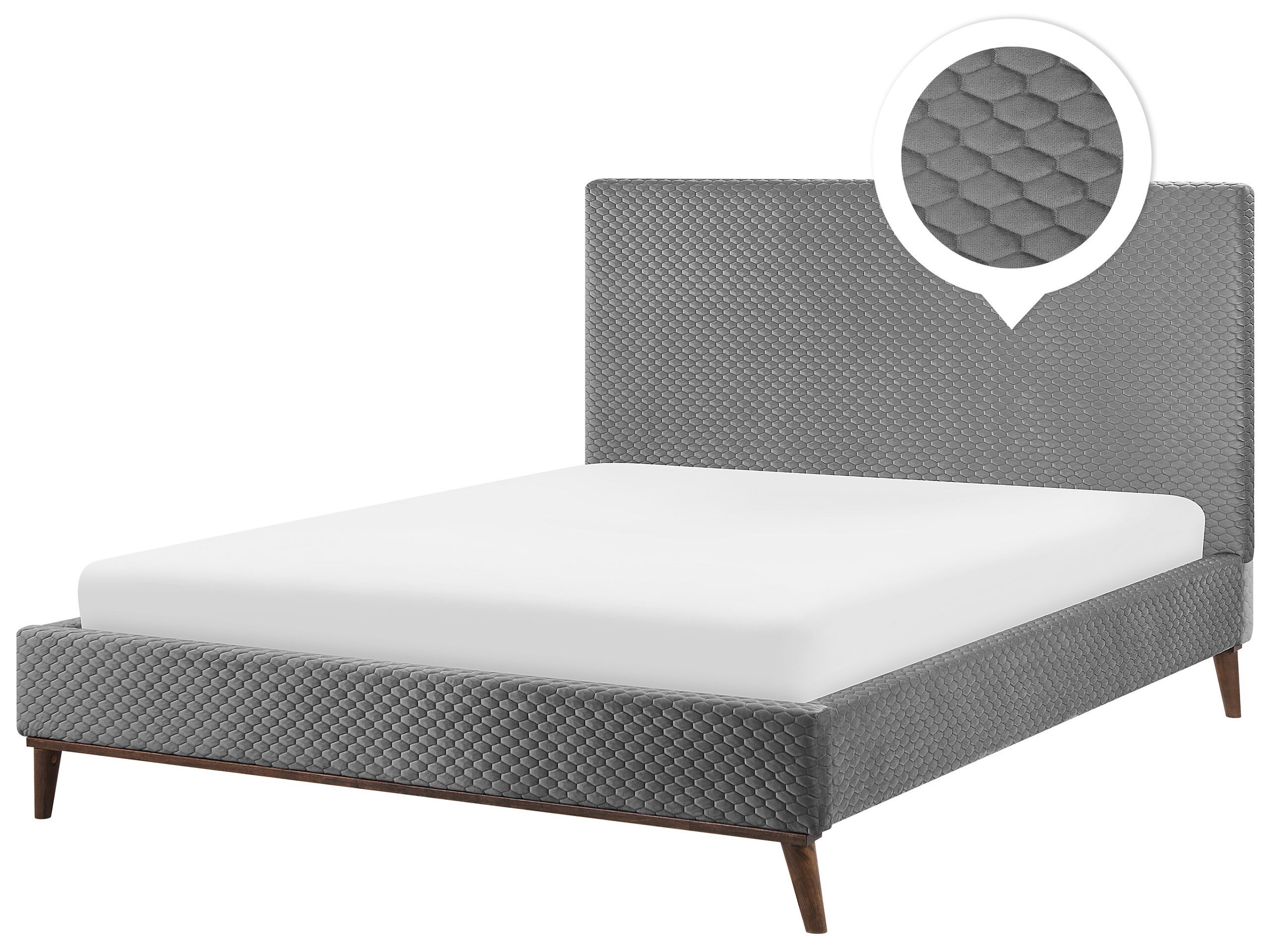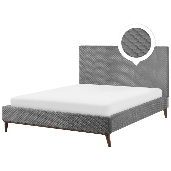 This modern bed is an ideal fit for a bedroom which aims for a perfect balance between elegance and simplicity. With a quilted headboard in a rectangular shape, and all sides featuring a soft, easy-care fabric in grey, it looks outstanding in any type of setting. Wooden construction ensures long-term stability, while the stylish legs, made of dark wood, beautifully harmonise with the whole piece. Details: Color: Grey, Dark Wood. Main material: Velvet. Additional material: Polyester, Plywood, Rubberwood, MDF. Material Composition: 100% Polyester Weight: 50 Assembly: Full Assembly Required Wood type: Hevea brasiliensis Wood Origin: Malaysia Weight Capacity: 200 Legs Height: 15.5 Sleeping Surface: 180x200