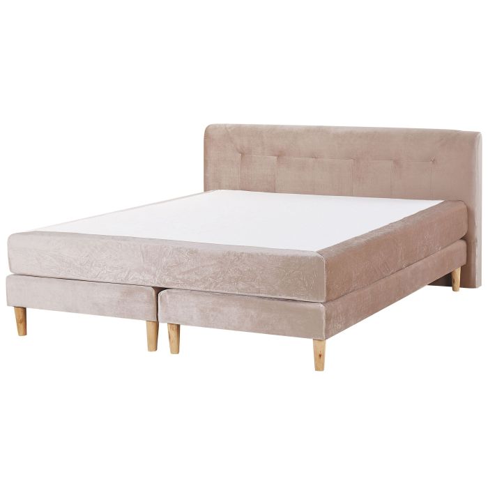 This divan bed with a tufted headboard perfectly complements any bedroom, bringing in a sleek, modern look. Upholstered in durable and pleasant to the touch velvet fabric, it is easy to maintain. Sleeping comfort is ensured by a high-quality mattress and two robust box springs, supported by solid wooden legs. Details: Color: Beige, Pink. Main material: Velvet. Additional material: Pine Wood, Plywood. Material Composition: 100% Polyester Weight: 114 Assembly: Full Assembly Required Wood type: Pinus radiata Wood Origin: China Weight Capacity: 300 Legs Height: 16 Sleeping Surface: 180x200