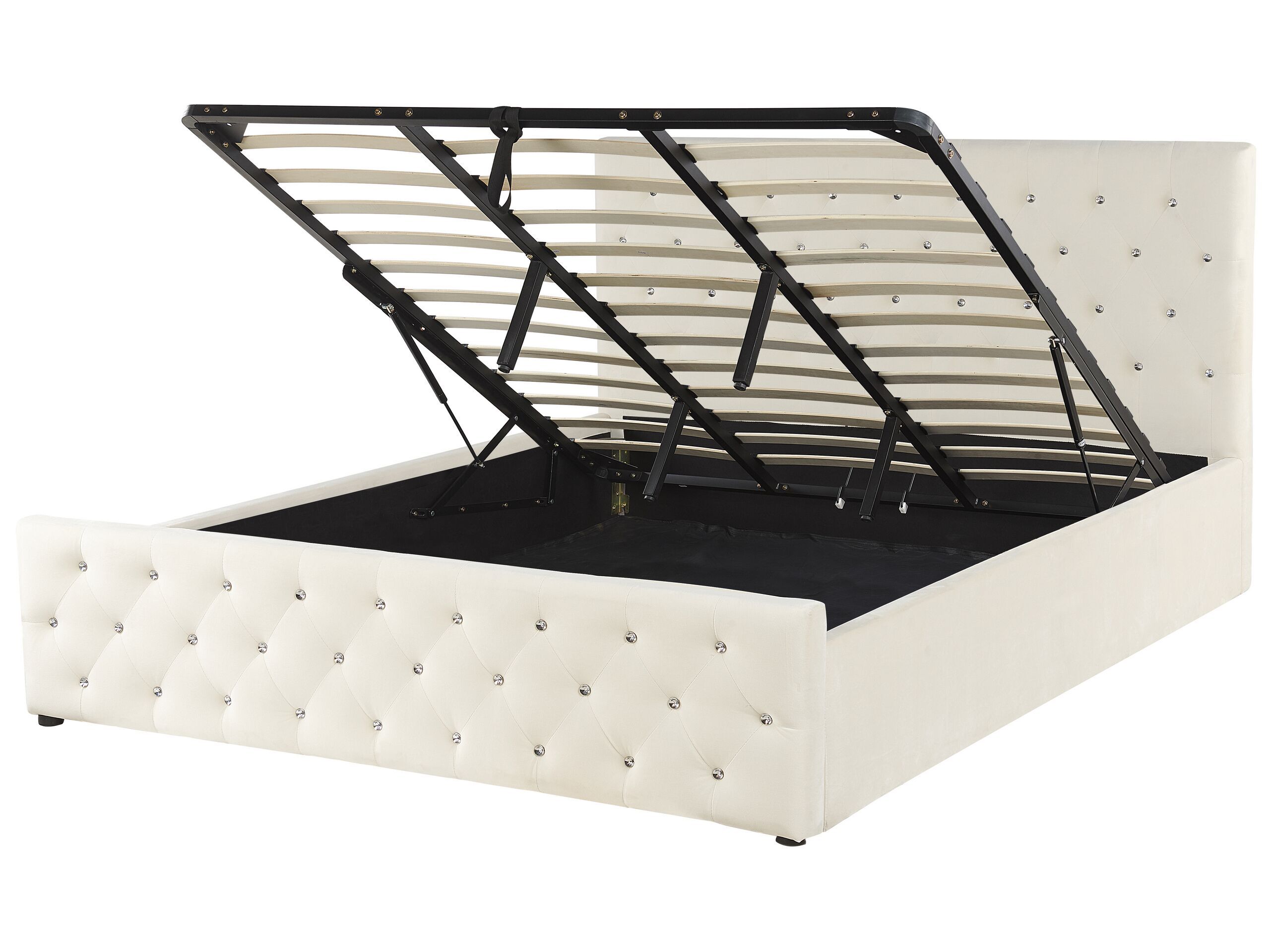 A perfect bed is crucial for a good night's rest, this one offers not only comfort, but also an elegant, upscale look. Its metal frame is covered with and upholstery fashioned from soft and silky velvet fabric in a neutral colour. The piece features a headboard and footboard are decorated with a subtle tuft and radiant faux crystals for a glamour touch. The bed comes with an ottoman storage which will easily fit all your sheets and bedroom accessories. Details: Color: Beige. Main material: Velvet. Additional material: Synthetic Material, Poplar Wood. Material Composition: 100% Polyester Weight: 53 Assembly: Full Assembly Required Wood type: Populus Wood Origin: China Weight Capacity: 200 Legs Height: 2 Sleeping Surface: 180x200