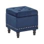 Classic design footstool on solid wooden legs makes a complementary accent for all elegant interiors, both modern and traditional. The button-tufted seating surface coupled with nailhead trim gives off the glamour effect. Pleasantly smooth to touch velvet upholstery in deep blue has a beautiful sheen. The top lifts off to offer capacious storage. The footstool brings a chic touch to any living area, bedroom, or hall. Details: Color: Blue. Main material: Velvet. Additional material: Rubberwood, MDF. Material Composition: 100% Polyester Weight: 5 Assembly: Legs to be Fitted Weight Capacity: 110 Legs Height: 10