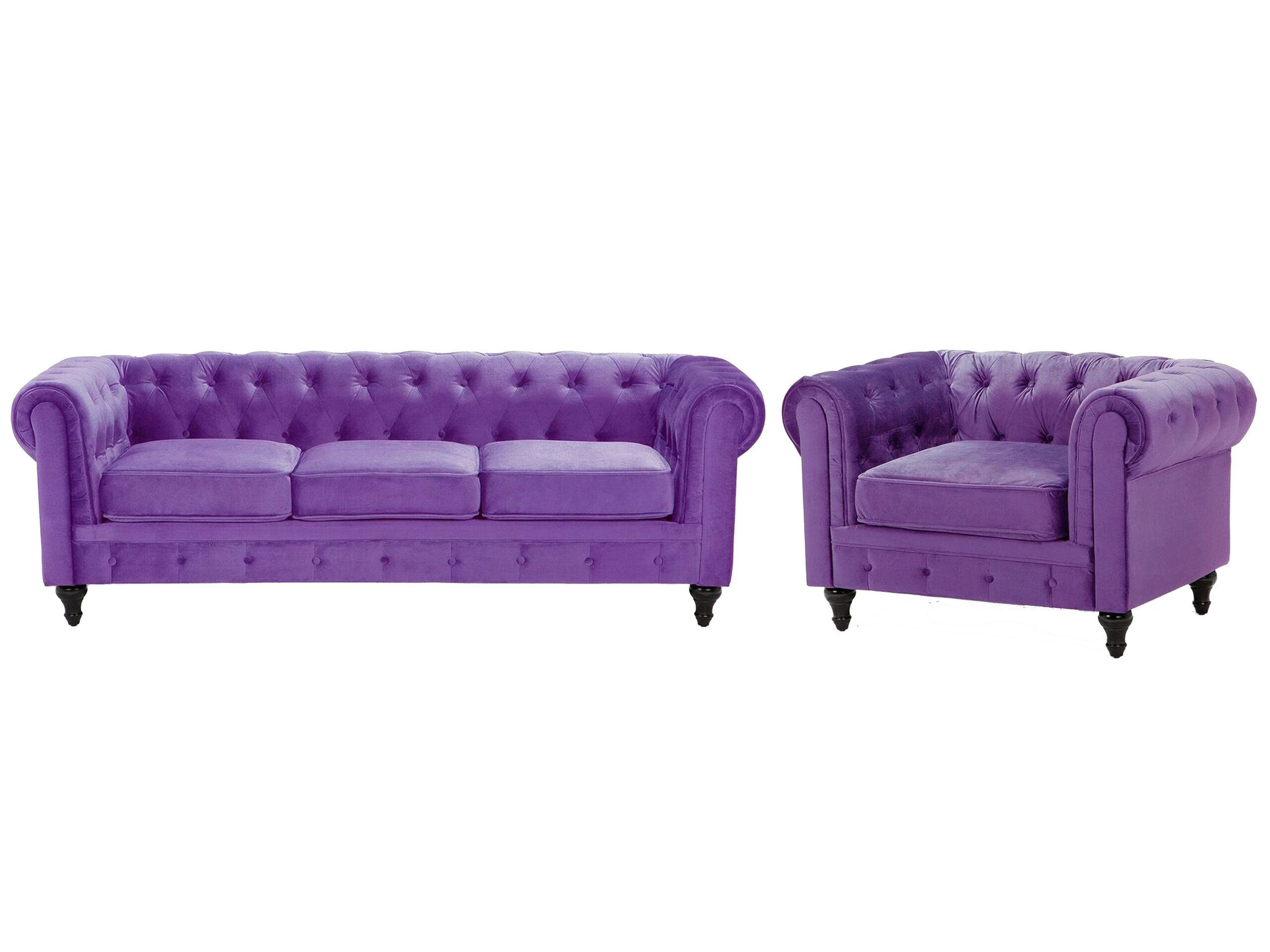 Characterized by a sleek silhouette with wide scroll arms, this sofa set features an iconic Chesterfield style that suits any modern or traditional interior. The low backrest, thickly padded seat cushions as well as ornate rubberwood legs provide the best sitting comfort and stability. Upholstered in a velvet fabric in purple, the seats present classic diamond button tufting. This English classic is easy to care for and looks great with any home decor, modern or traditional. The seat cushions feature a removable cover that translates to easy cleaning without a worry for stains. Details: Color: Violet, Dark Wood. Main material: Velvet. Additional material: Rubberwood, Eucalyptus Wood. Material Composition: 100% Polyester Weight: 79 Capacity: 4 People Assembly: Legs to be Fitted Wood type: Hevea brasiliensis Wood Origin: China Overall Dimensions: 201x75x70 Legs Height: 12 Padding Thickness: 15 3 Seater Sofa Dimensions: 201x75x70 Seat Height: 45 Armchair Dimensions: 110x75x70