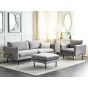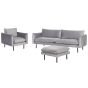 This living room set turns any living room into a place of relaxation and leisure. Soft and comfy thanks to the generously padded seat and back cushions, it offers enough space to stretch your legs and enjoy a favourite book. The set includes a sofa, an armchair and an ottoman, all with wooden construction and metal legs which provide stability, while the soft velvet upholstery gives it an elegant look thanks to its distinctive sheen. Whether in a modern, traditional, or industrial setting, the 3-piece suite becomes a highlight of any interior in an instant. Details: Color: Grey, Black. Main material: Velvet. Additional material: Plywood, Pine Wood, Aluminium. Material Composition: 100% Polyester Weight: 90 Capacity: 5 People Assembly: Legs to be Fitted Overall Dimensions: 220x85x85 Cushions Dimensions: 98x40 Legs Height: 20 Padding Thickness: 16 Ottoman Dimensions: 70x70x44 3 Seater Sofa Dimensions: 220x84x86 Seat Height: 44 Armchair Dimensions: 83x84x86