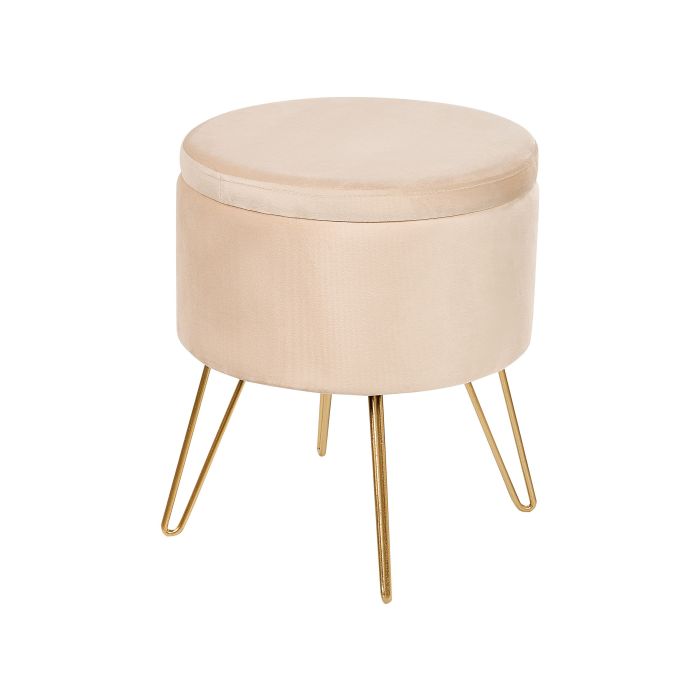 Indulge in the opulent charm of this stylish storage pouffe. Wrapped in a timeless shade of luxurious velvet fabric, this piece embodies modern glamour. Its eye-catching pin-style metal legs, finished in a radiant gold, add a touch of sophistication to any room. With hidden storage tucked beneath its plush cushion, this stool seamlessly combines elegance and functionality for a truly captivating addition to your living space. Details: Color: Beige, Gold. Main material: Velvet. Additional material: MDF, Plywood, Iron. Material Composition: 100% Polyester Weight: 3 Assembly: Partial Assembly Required Weight Capacity: 150 Legs Height: 22