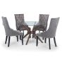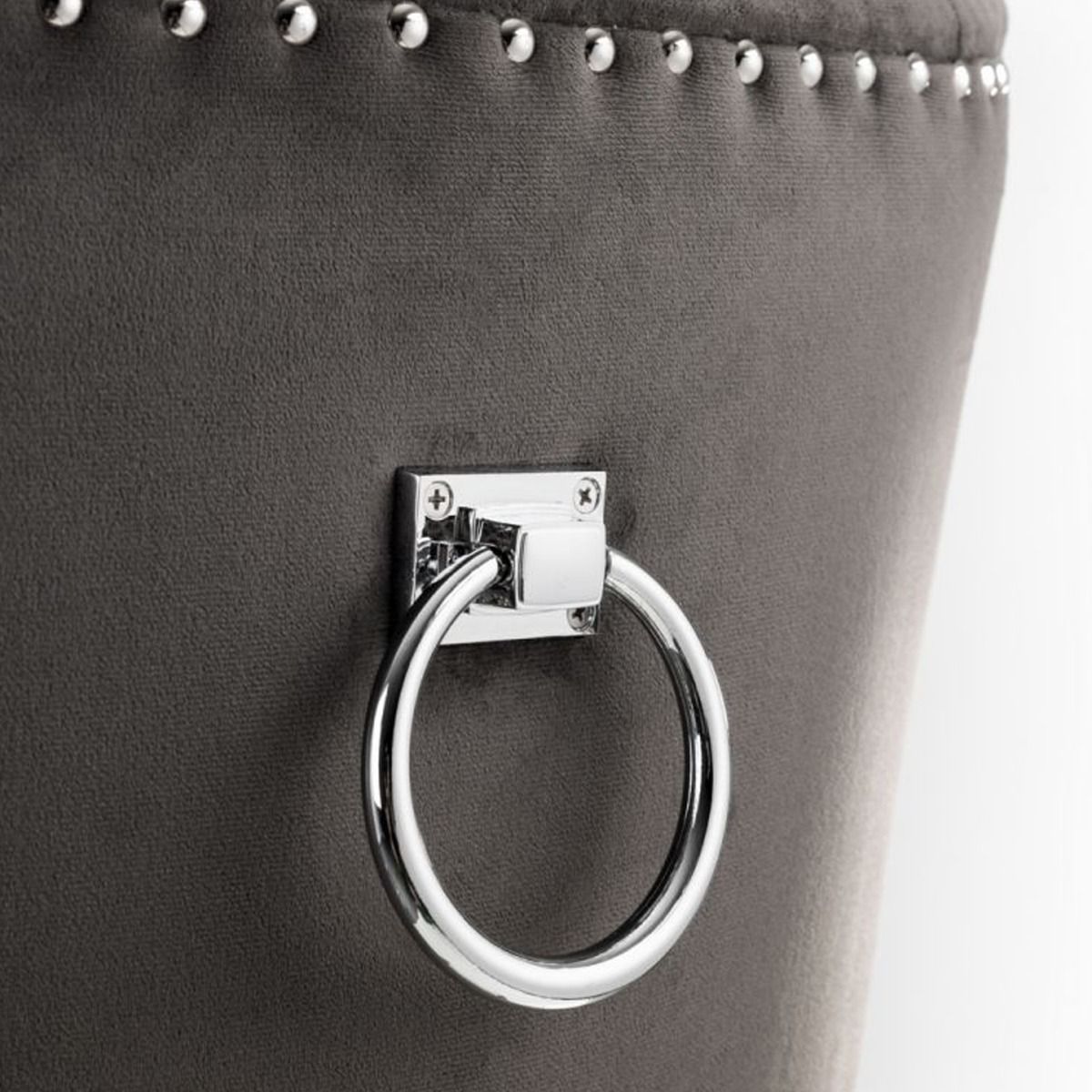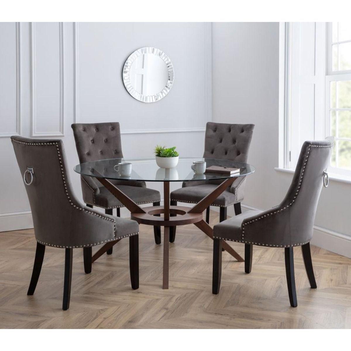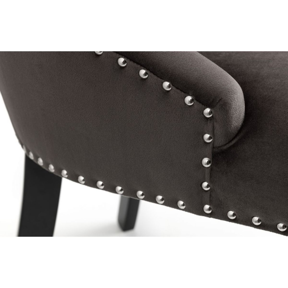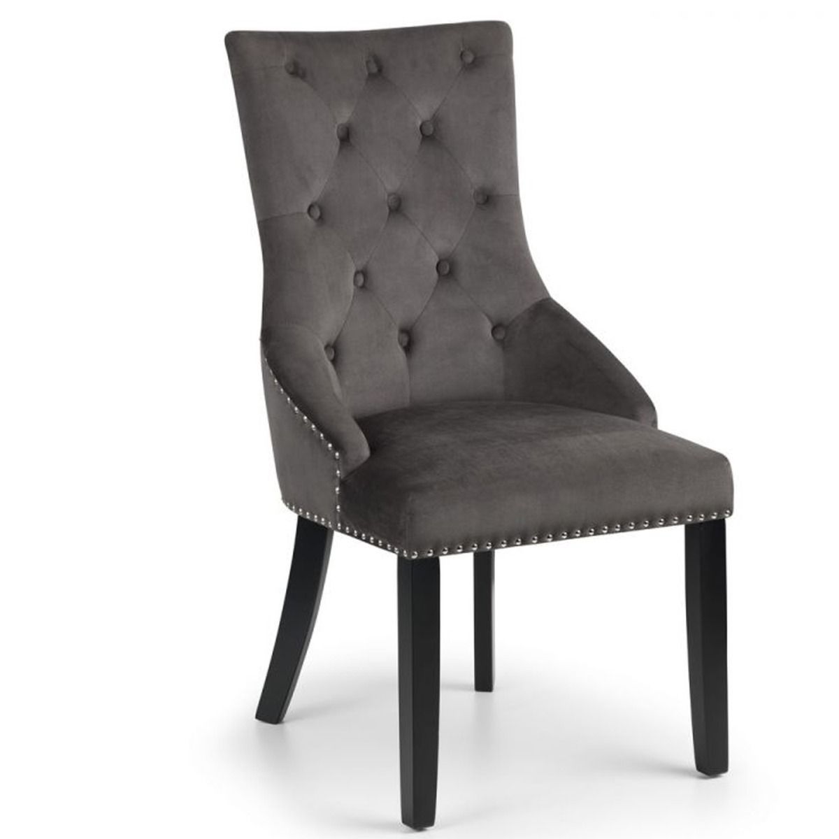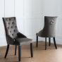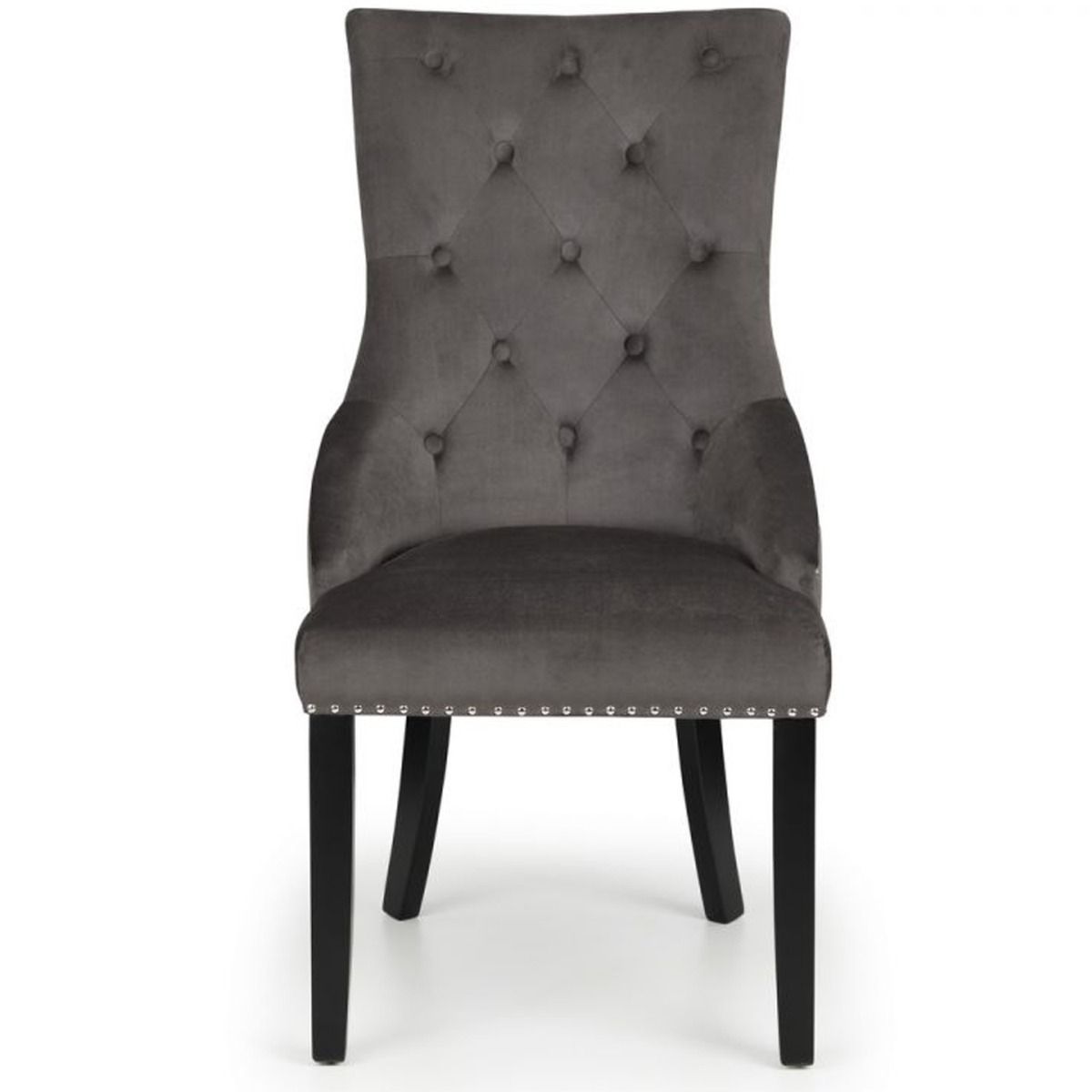 Upholstered in a soft touch luxurious grey velvet fabric, the Veneto Knockerback chair has a metal ring detail on the back along with glamourous deep buttoning and a metal stud trim.