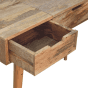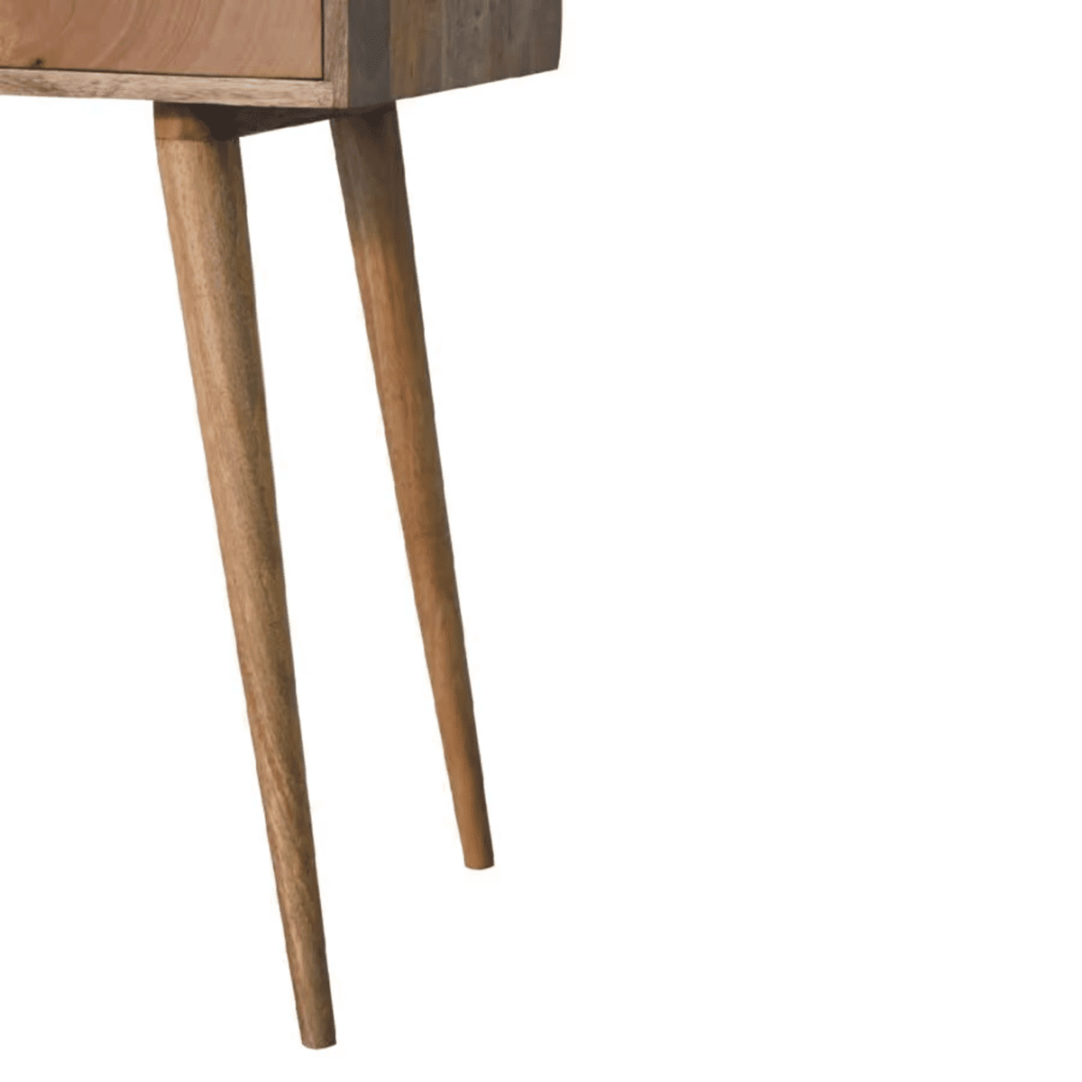 Add this beautiful dressing table to your home. Constructed from 100% solid mango wood in an oak-ish finish with 3 spacious drawers, it features a foldable mirror and storage compartments for storing any bits and pieces. Other product features - include Nordic style legs and cut-out slots for easy access to and from the drawers. A lovely versatile piece that will complement any room beautifully.