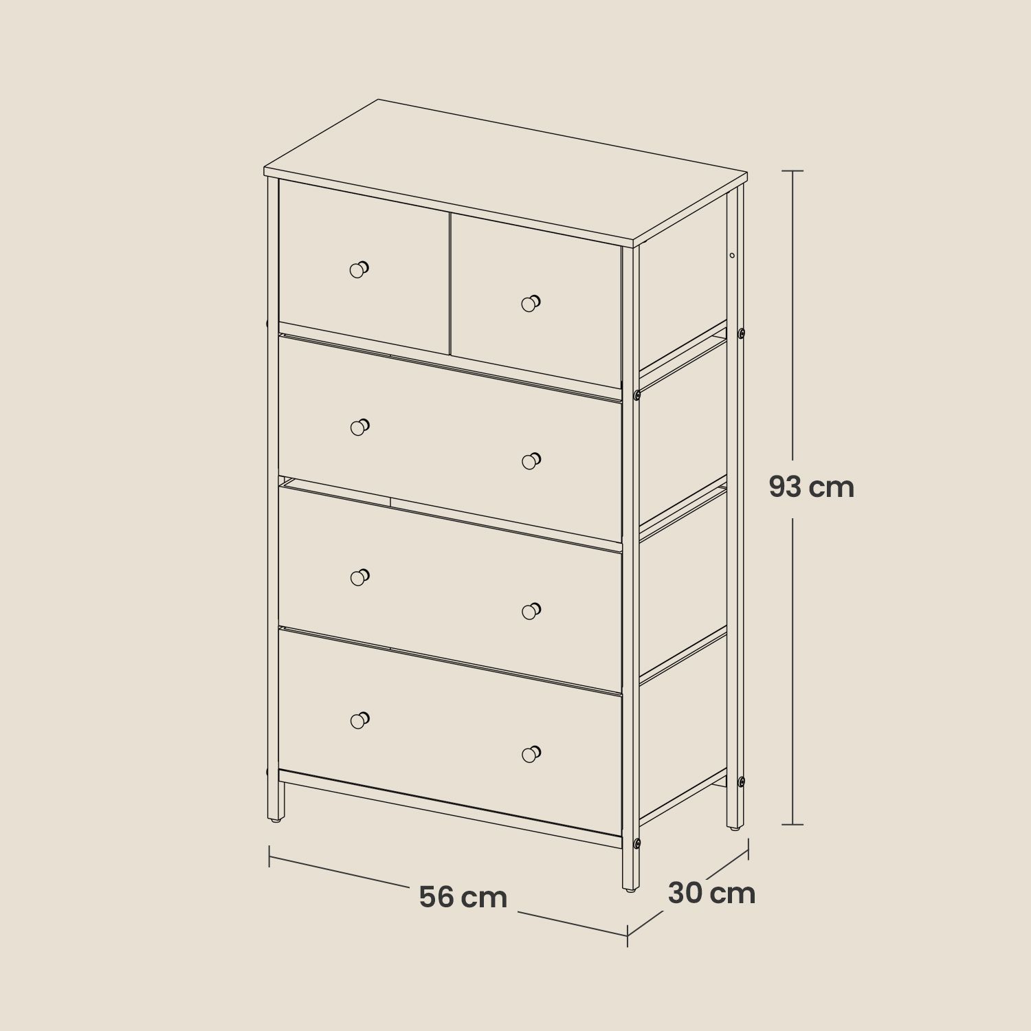 Organize your space with the LGS45H Industrial Style 5-Drawer Fabric Storage Unit. This versatile dresser, featuring a rustic brown and black steel frame, is perfect for your living room, hallway, or children's room. Its five spacious fabric drawers offer ample storage for clothes, toys, or essentials, blending style with practical organization.