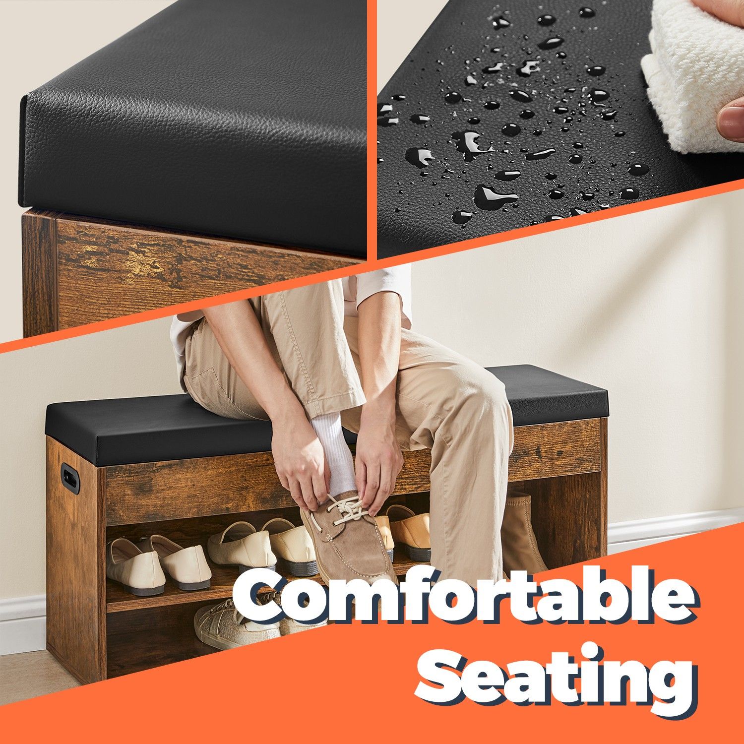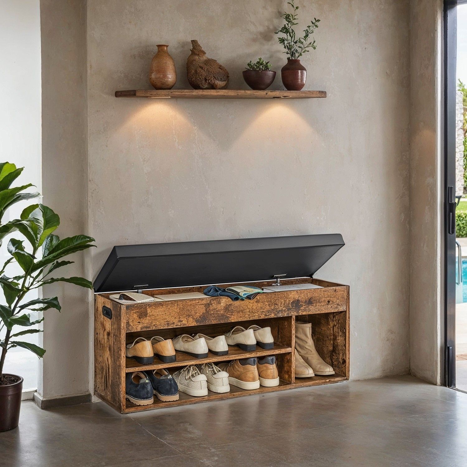 VERRA Shoe Bench - 3 Compartment Lid Storage Cushion Medium Sized Bench - Brown