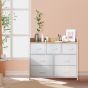 This modern chest of drawers, finished in a stylish dove grey and cloud white, is the perfect addition to any bedroom. Featuring a sturdy metal frame and seven spacious drawers, it offers ample storage for your clothing and accessories. Its sleek design complements contemporary decor, making it a functional and attractive furniture piece.