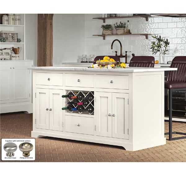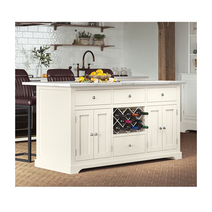 Introducing our elegant and versatile kitchen island, featuring a cream painted base and luxurious white marble worktop, adding sophistication to any kitchen space. This multifunctional island serves as an ideal hub for storage, food preparation, or casual dining, catering to various culinary needs and social occasions. With three drawers and two large cupboards offering adjustable shelving options, organizing kitchen essentials is a breeze.