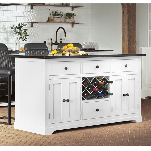 Introducing our stylish and multifunctional kitchen island, featuring a white painted base and sleek black granite worktop. Perfect for storage, food preparation, or casual dining, this island serves as a central point for socializing with family and guests. The durable granite worktop offers a long-lasting surface, with the option to have it centrally placed or with a 19cm overhang for use as a breakfast bar. With three top drawers, one central bottom drawer, and two large cupboards, each with adjustable shelves, this island provides versatile storage options.