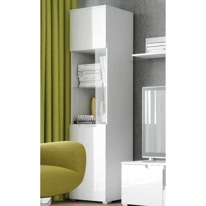 Tall display cabinet in white gloss with ample internal storage. This stylish display cabinet features 1 glass door with shelving providing a smart storage solution.