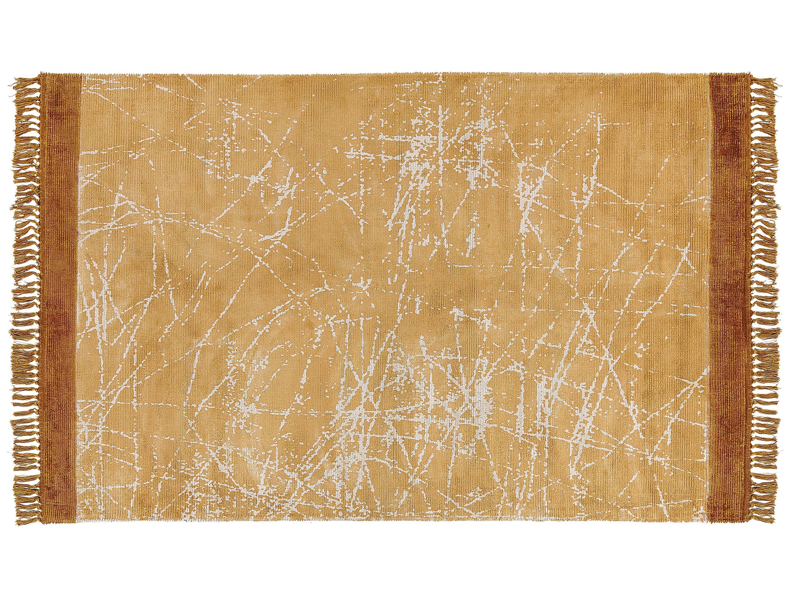 Place this rectangular rug in your living room or bedroom to instantly give them a modern touch. This accessory will do that thanks to its high-quality viscose material, which makes it very pleasant to touch, as well as an attention drawing front, mixing orange background with white, uneven stripes. The piece is also handmade, so you can be sure that your rug will be unique. Details: Color: Orange, White. Main material: Viscose. Additional material: Cotton. Material Composition: 100% Viscose Weight: 8 Assembly: Does Not Require Assembly