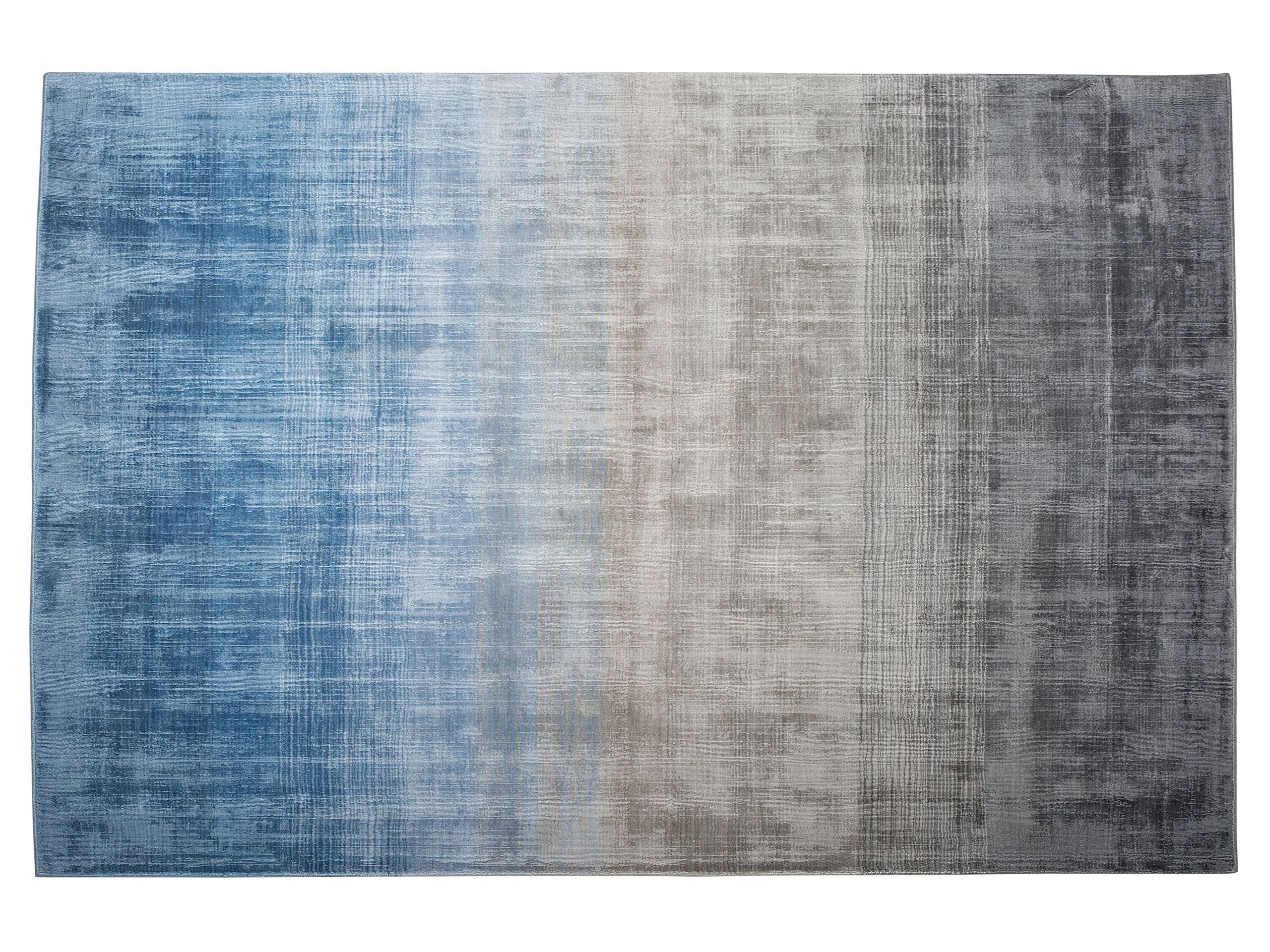 Reinvent your home interior with the gradient area rug. Featuring a bold ombre effect based on shades of grey with a pop of colour, this rug easily fits in modern, minimalistic, and contemporary decors. The rug is skilfully hand-loomed and made of soft viscose fibres with a slightly shiny finish that can be seen both up close, and from a distance. Thanks to that, it is a perfect accent rug for a living room, dining room, or bedroom. Details: Color: Multicolour, Beige, Blue, Grey. Main material: Viscose. Material Composition: 100% Viscose Weight: 10 Assembly: Does Not Require Assembly