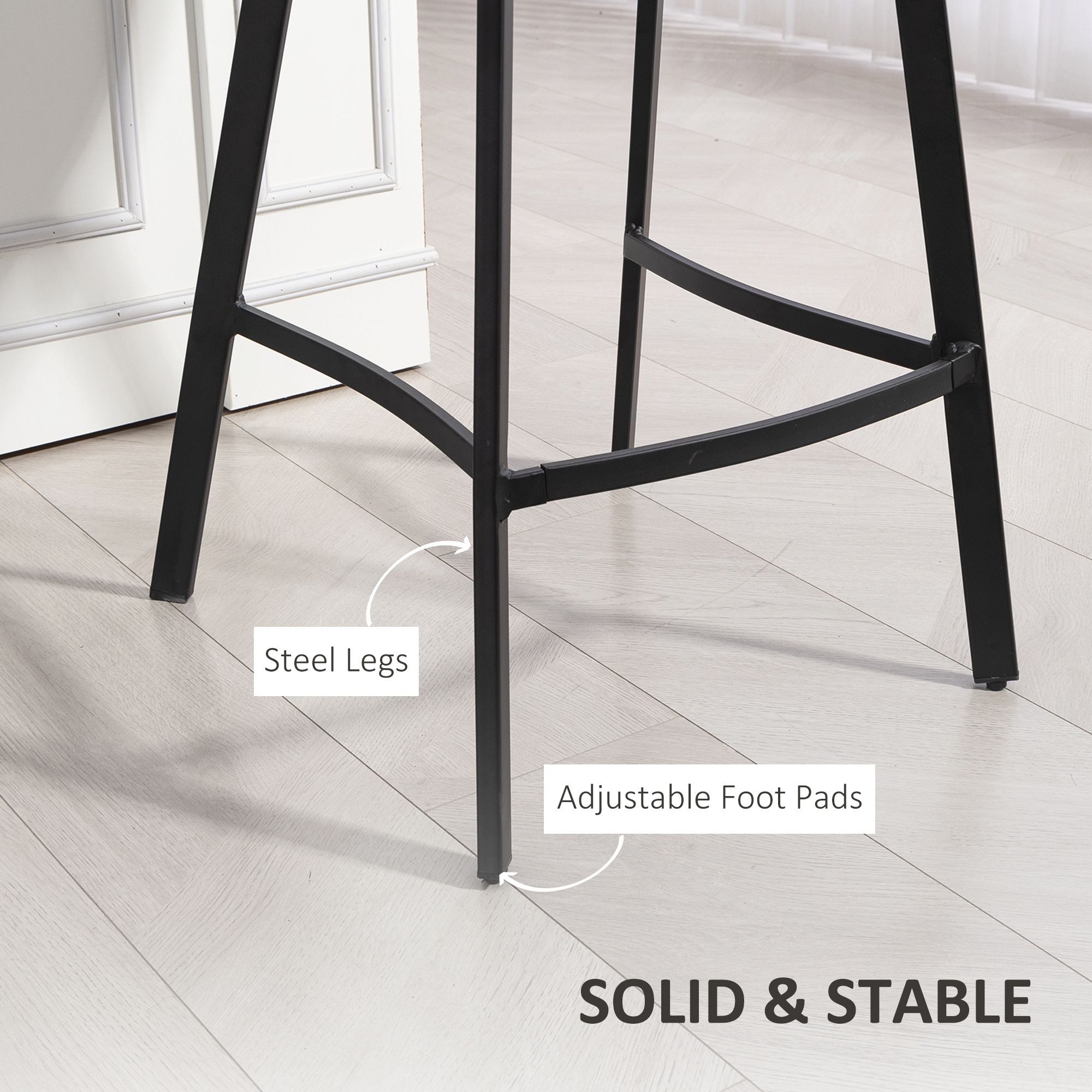 Accent your home bar area with these two VORNIX kitchen stools with backs. Faux leather upholstery is smooth and stylish. The frame, made from powder coated steel, is strong and supports you when seated. Attached adjustable foot pads to keep these barstools standing steady and balanced, at all times.