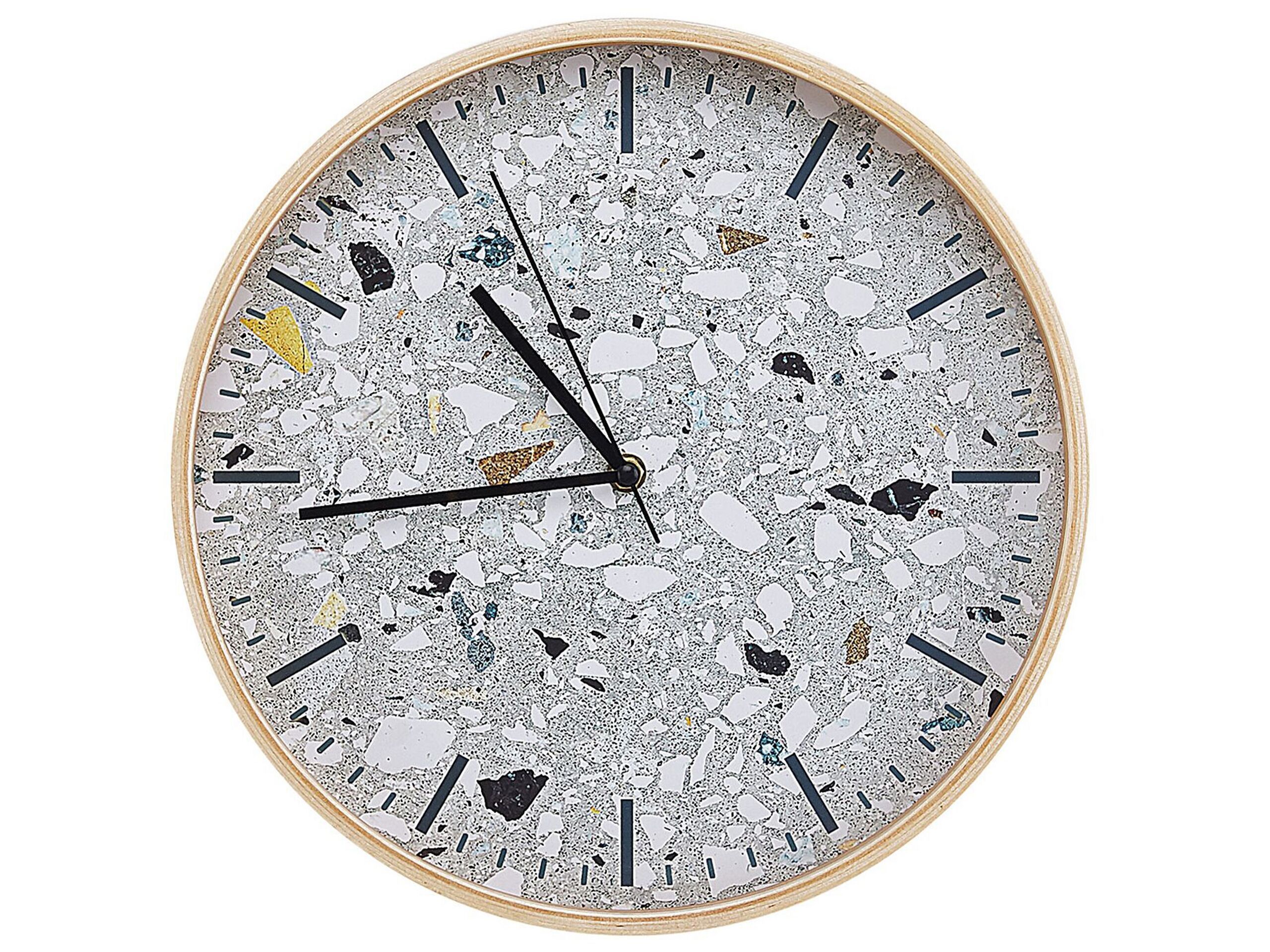 Add a retro vibe to your surroundings with this extraordinary wall clock. Its round shape with MDF frame in light wood colour allows it to blend well with any interior. Its face design presenting a granite effect makes the clock unique and certainly will become a centrepiece of your interior. The item is made from high quality materials, which are easy to maintain. Details: Color: Grey, Light Wood. Main material: MDF. Weight: 1 Assembly: Does Not Require Assembly