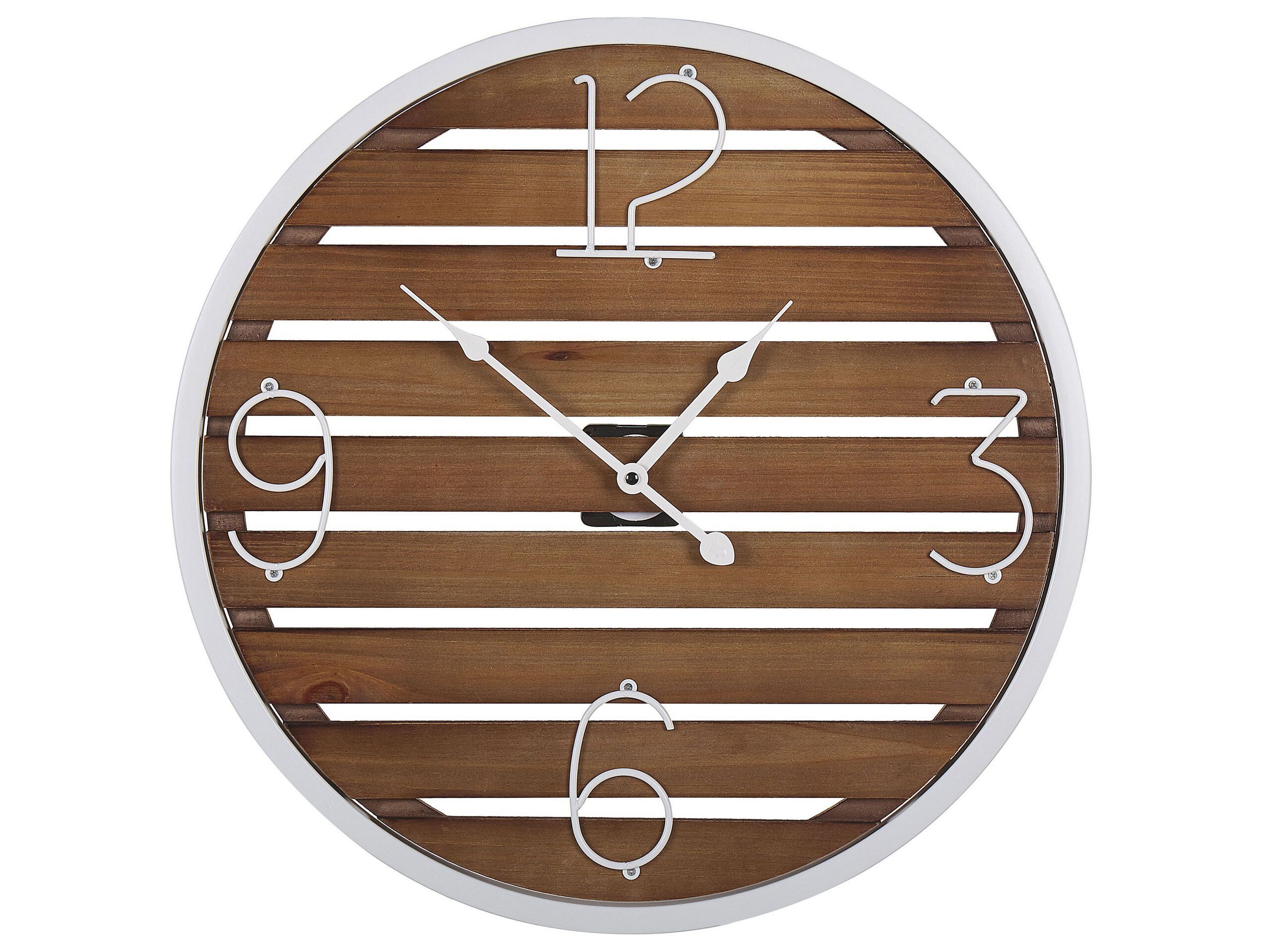 This wonderful clock makes a splendid accent within any retro and traditional space. Its characteristic, inspired by coastal forms, slatted face is handmade from durable wood. The dark, natural finish is highlighted by the contrasting frame in white. The clock features large numerals and hands for easy use. Details: Color: Dark Wood, White. Main material: Fir Wood. Additional material: Synthetic Material, Metal, MDF. Weight: 1 Assembly: Does Not Require Assembly