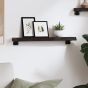 Do you need more storage options but don't have any spare space? This wall shelf in rustic style is the perfect solution. Durable construction: The wall shelf is made of solid oak wood, which is a beautiful natural material. Oak wood has a medium brown colour and a dense grain, contributing to its unique look.Versatile applications: Besides a shelf, this storage shelf can be combined with different bases according to your needs. It can be used as a bathroom top, cabinet top, desk top, table top etc.Treated surface: The wooden shelf has been treated with dark paint so it is ready for use as an additional finish is not required.Handmade with live edge: This shelf board is handmade with a live edge. Due to that the knots, cracks, slightly curved shapes, and colour tones are part of the oak wood, every piece of shelf has its own unique character to display. The delivery is random, ensuring the exclusivity and individuality of your product.