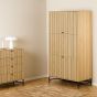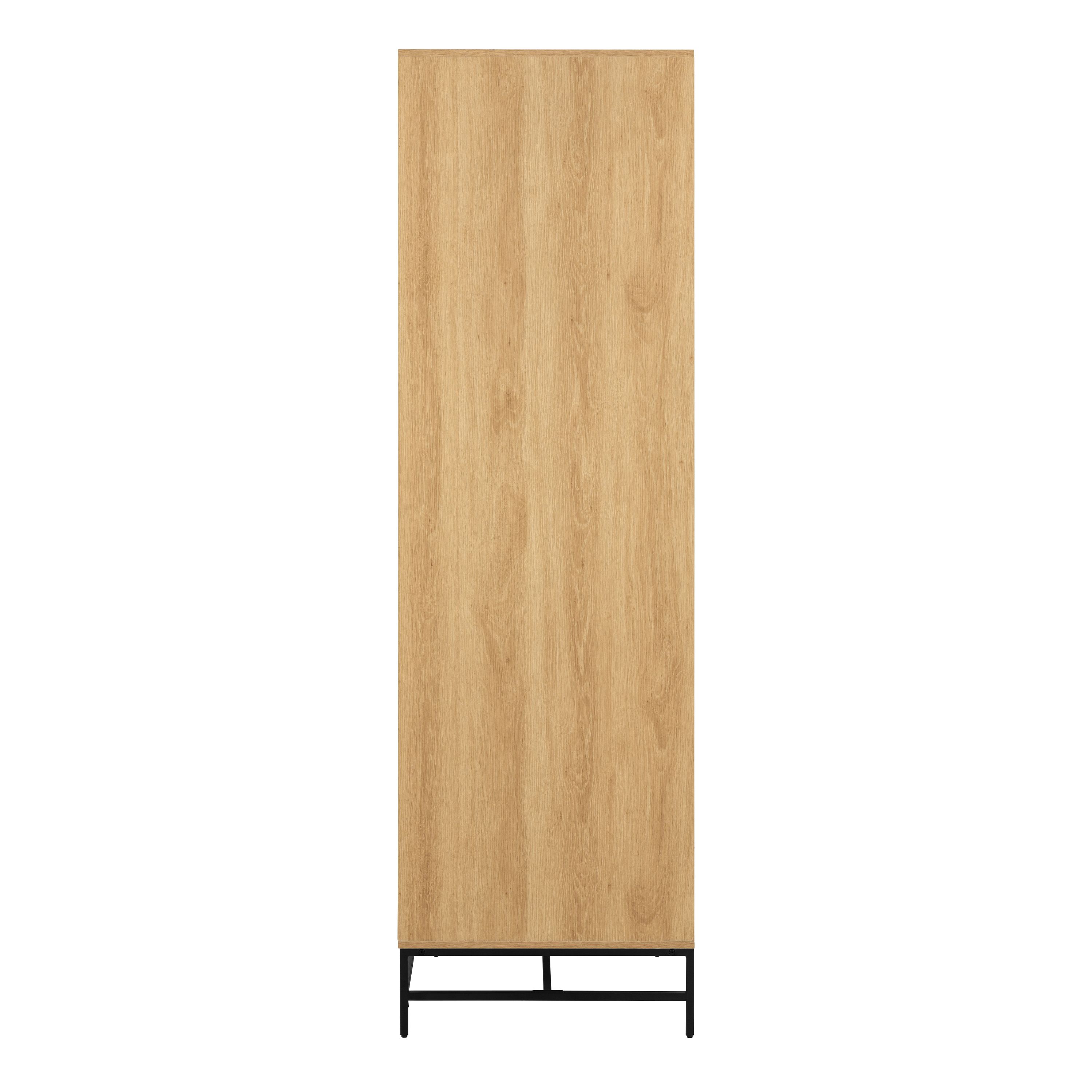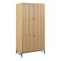 The ARISTA wardrobe offers spacious and stylish storage with its modern design. Made from oak rough melamine, it features a frame with four doors, six adjustable shelves, and a clothes bar, providing ample space for all your clothing and accessories. The lamella fronts add a touch of texture, while the black powder-coated steel base brings an industrial edge. Measuring 99x60x200 cm, this wardrobe combines functionality and contemporary aesthetics, making it a perfect addition to any bedroom or living space.