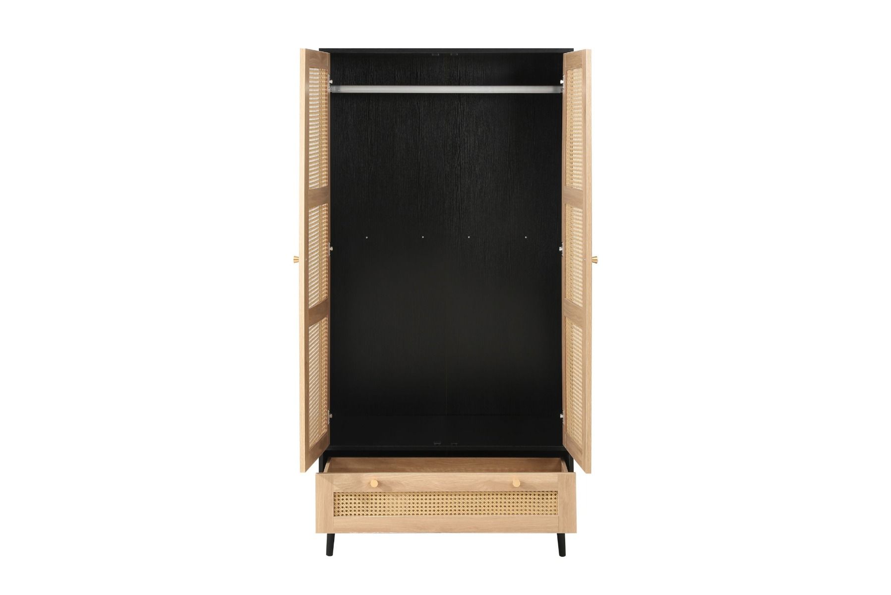 Wardrobe - CARDANO 2 Door 1 Drawer Rattan Wardrobe Black 90cm