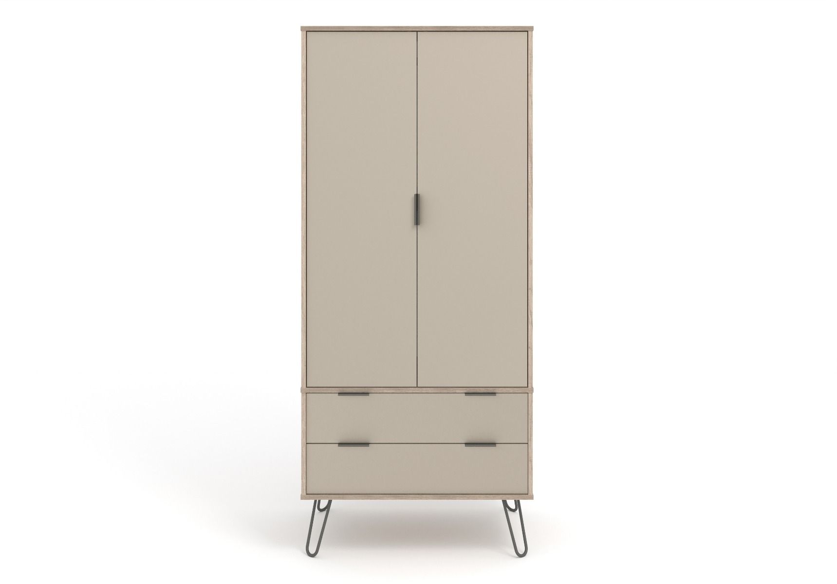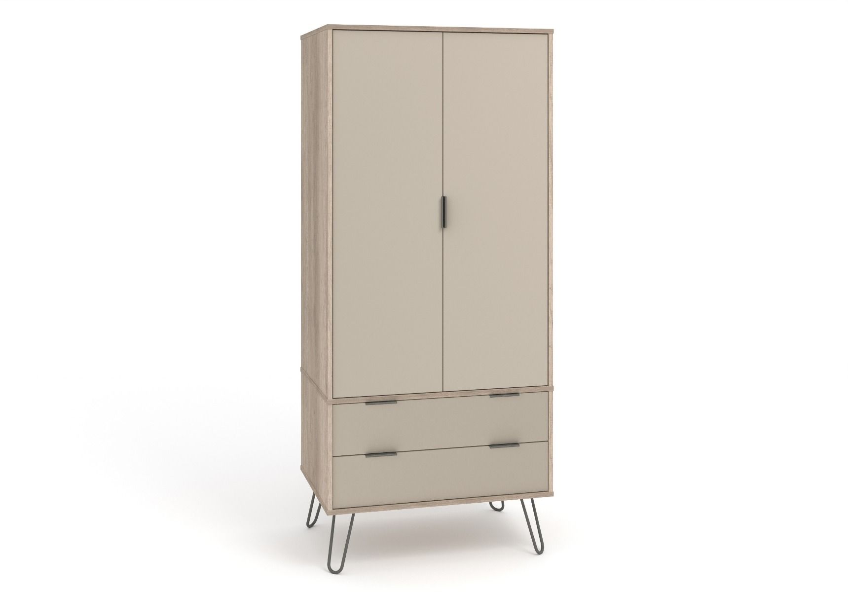 Compact and practical, this industrial look wardrobe offers plenty of drawer space along with a generous hanging space, all finished in stunning DELTUM and calico effect finishes in easy to clean melamine with plastic pull handles and metal feet.
