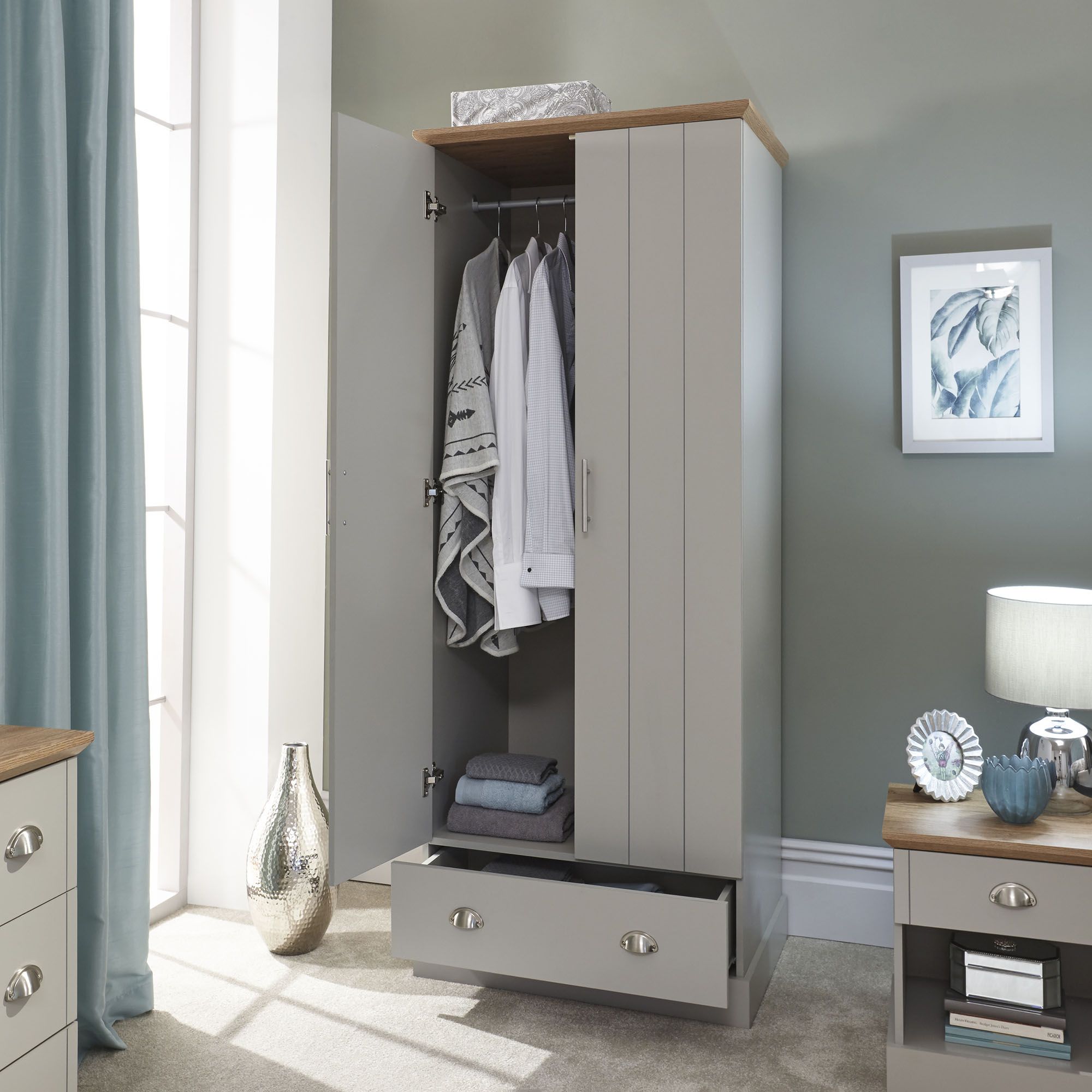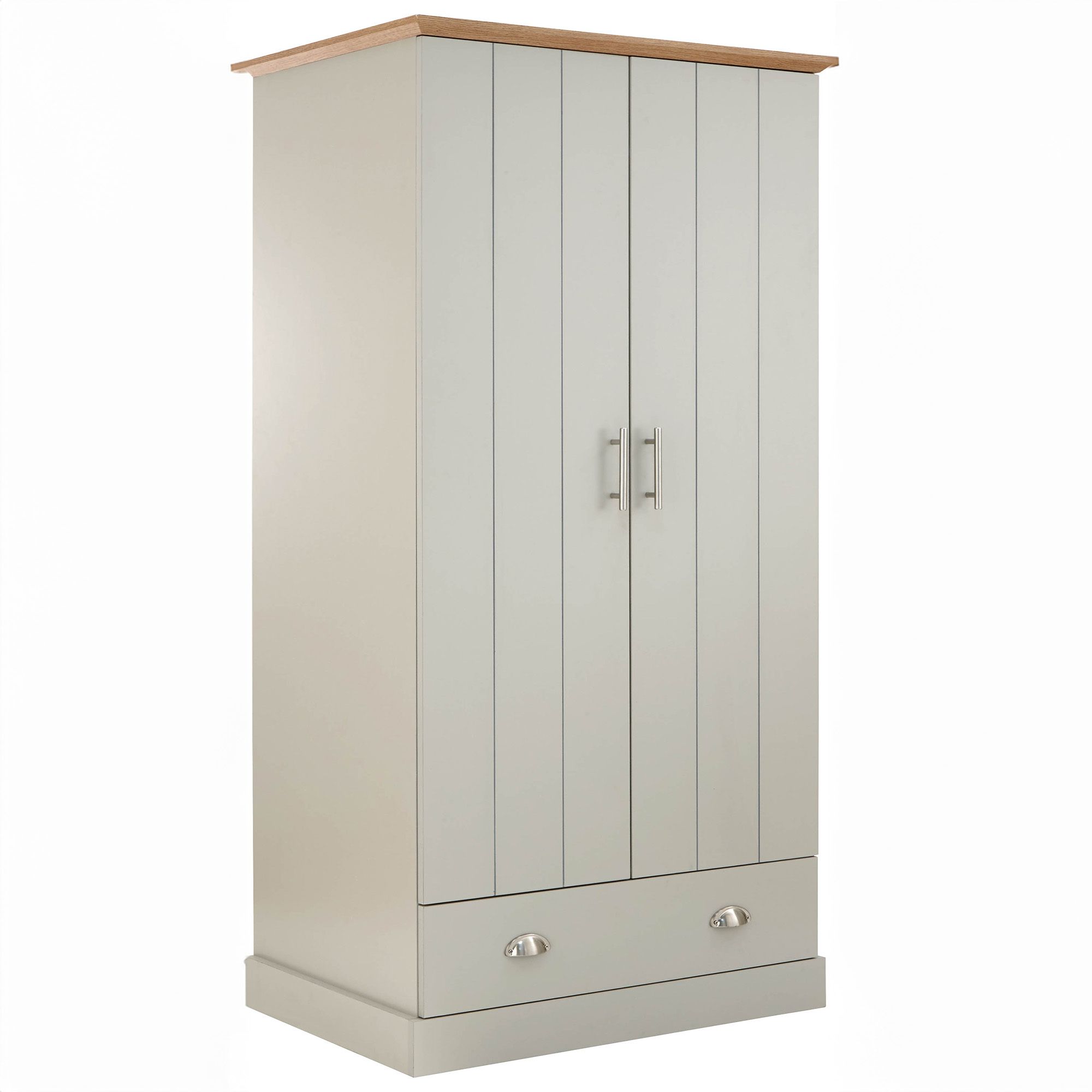 KESWICK brings a touch of country cottage chic to any bedroom - this two-door wardrobe is a perfect example. The robust frame is mounted on a proud plinth and fitted with a pair of planked-style doors, incorporating a handy drawer beneath. The piece is finished in soft grey and finished with a bevelled oak-effect top that adds a natural contrast. Accessorised with brushed steel handles, it makes an elegant choice.