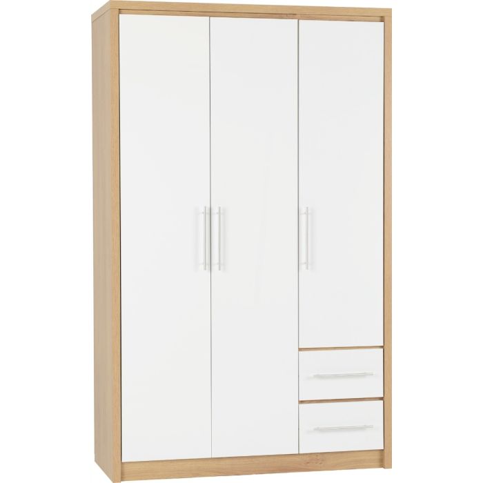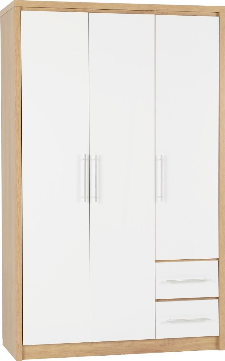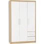 Wardrobe - SELSEY 3 Door Wardrobe White High Gloss with Light Oak 111cm