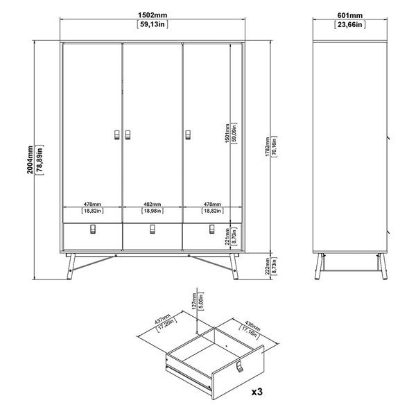 Wardrobe Set - RYTON 3 Door Bedroom Set 3 Piece Oak 150cm