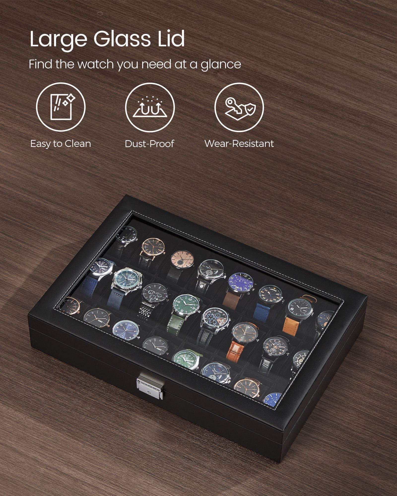 Watch Box - GRARIA Lockable 24 Slot Watch Organizer with Glass Lid - Black
