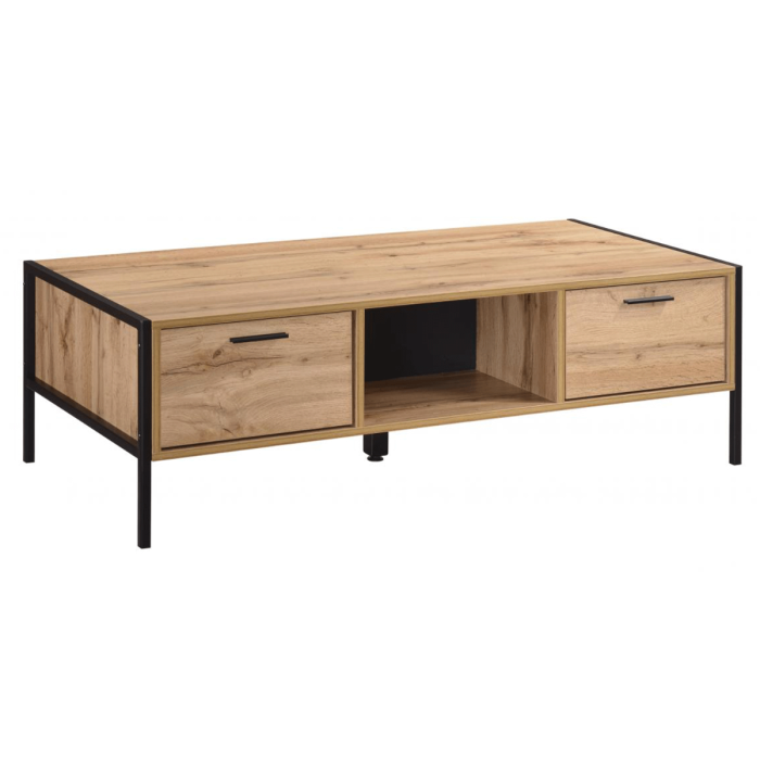 Wenatchee Rectangular Coffee Table Oak Effect with Black Metal Frame and 2 Drawers - Natural