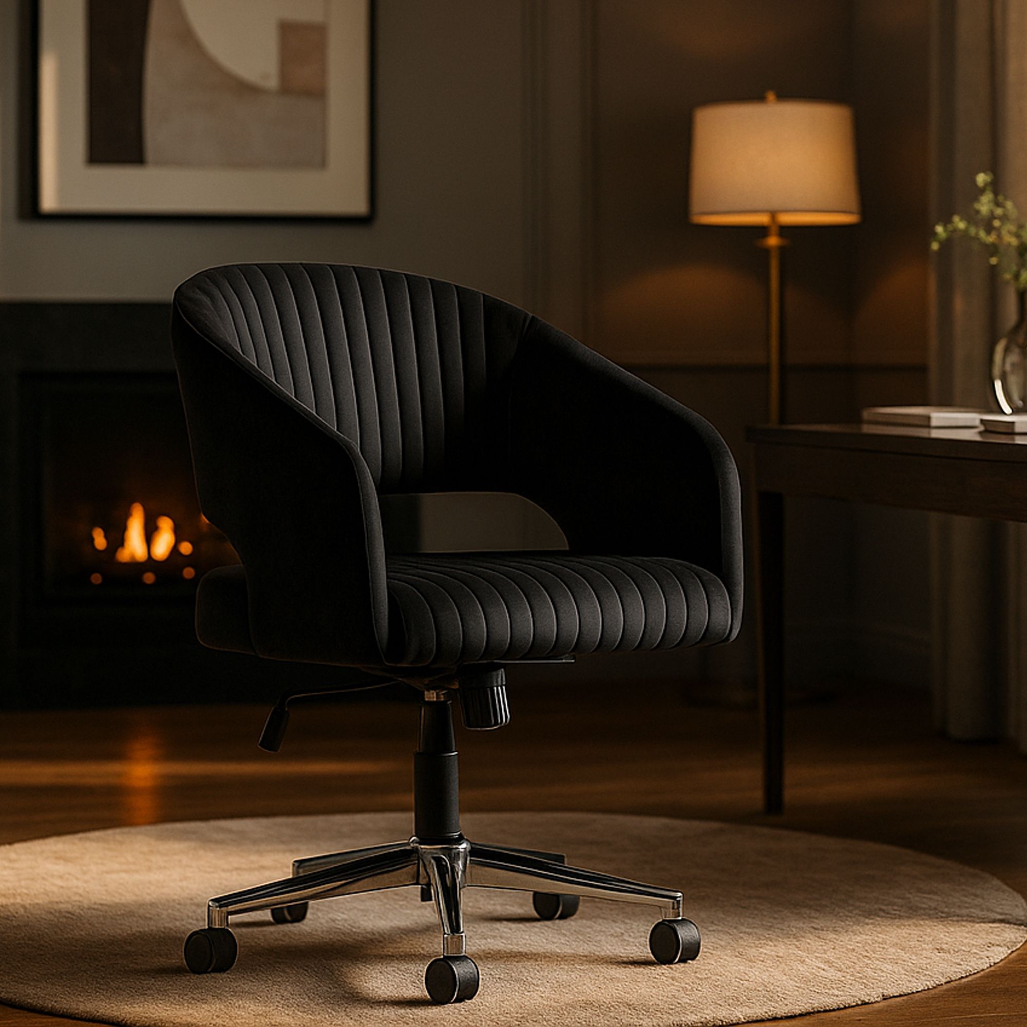 The WESTFIELD Velvet Swivel Chair - Black combines modern craftsmanship with a touch of traditional charm. Built to last and styled for versatility, it enhances any space effortlessly.
