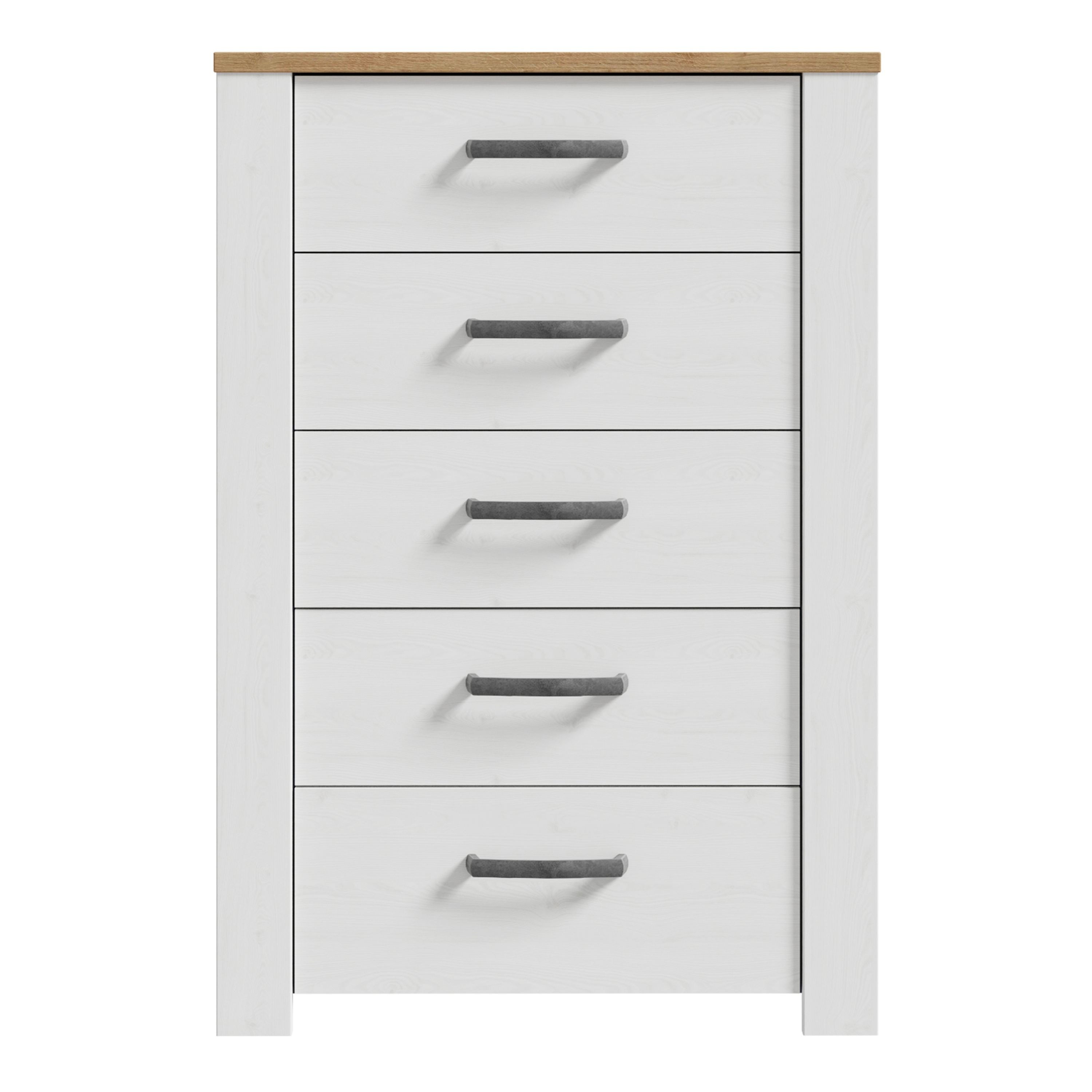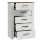 BUENOS 5 Drawer Narrow Chest in Riviera Oak/White. Provensal design with various storage options. Striking Riviera oak and Sibiu light larch finish. Selected elements protected by damage-resistant ABS edging.